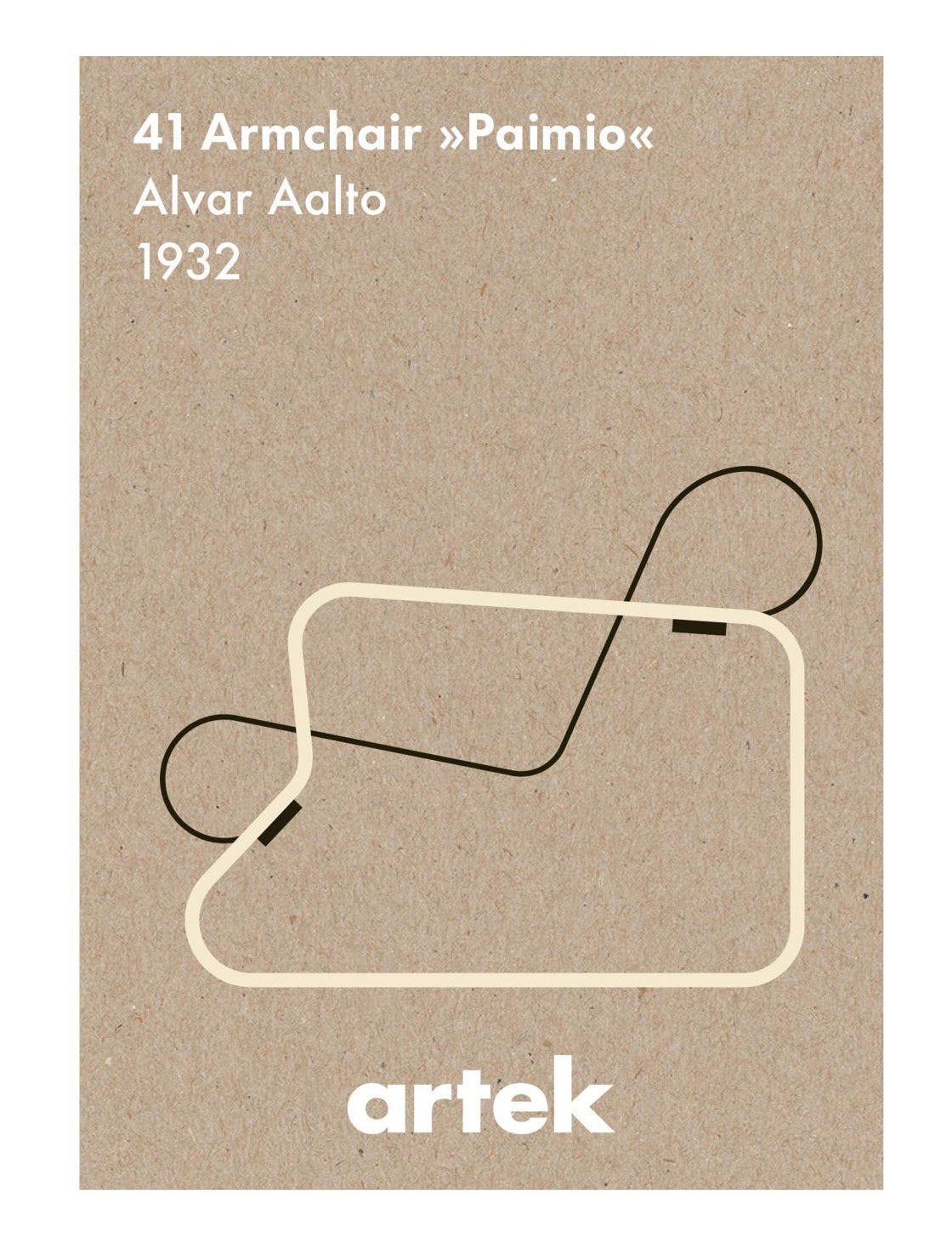 One of a series created to celebrate Artek’s history, this poster features the iconic Armchair 41 “Paimio.” Designed by Alvar Aalto for the Paimio Sanitorium in Finland, Armchair 41 set new standards in modern furniture design. Made of recycled paper, each poster in the Icon Series is silkscreen printed.