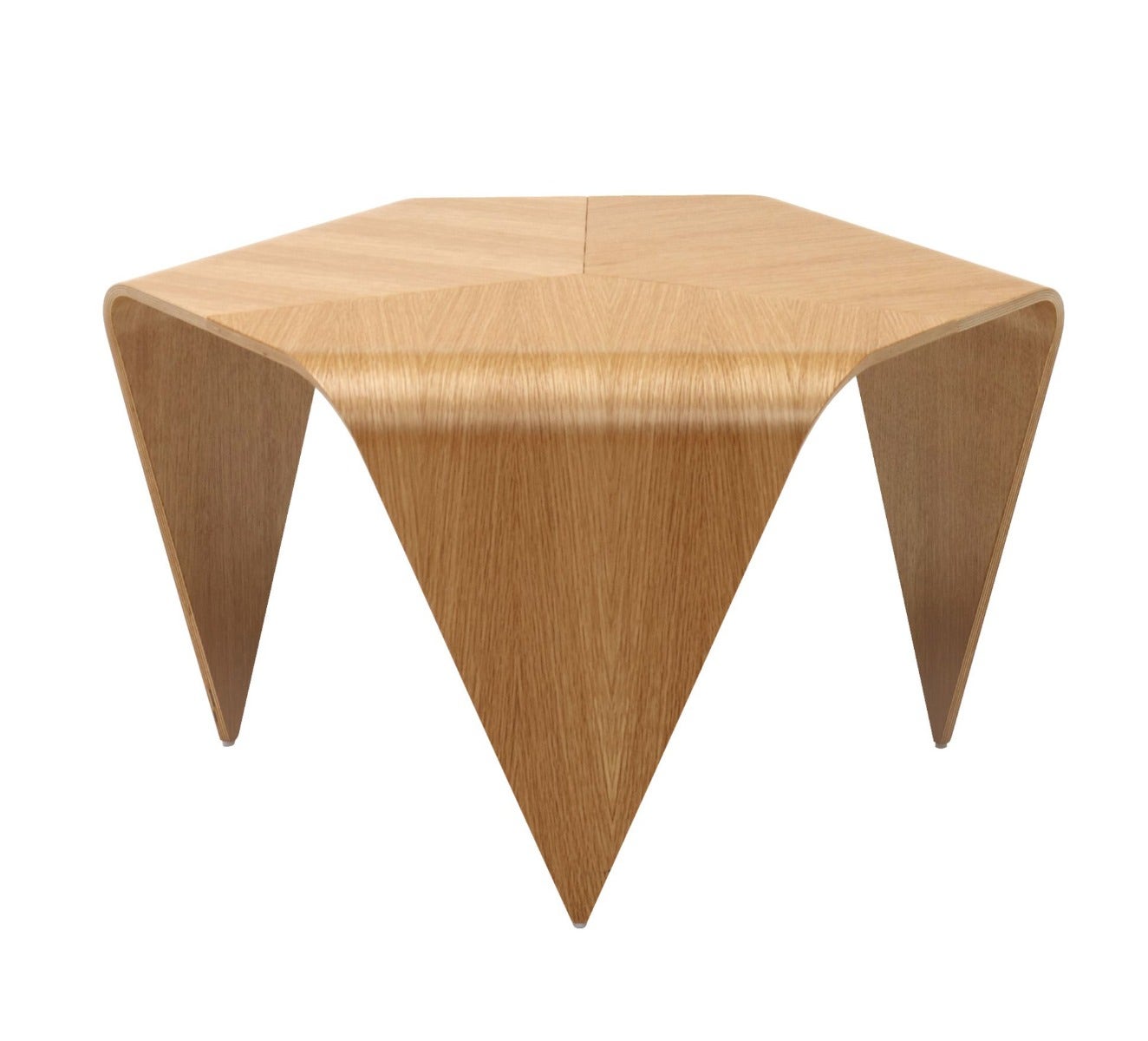 This incredibly distinctive table is formed from three sheets of pressed birch veneer. Designed by Ilmari Tapiovaara in the 1950s, the hexagonal table top is supported by three triangular legs. The seams between the pieces create a beautiful pattern on the table top. Lightweight and easy to transport, the Trienna Table is elegant by itself or as a fine centrepiece for creating exciting combinations.