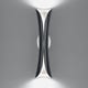 A curved aluminum panel envelopes and releases soft indirect light upwards while a separate source emits diffused light along the vertical aperture of the lamp.