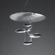 A suspension lamp that places a floating assembly of large pebbles below a simple modern aluminum disc. These in turn reflect each other bouncing light between their taught biomorphic surfaces and reflecting the environment around them. During the day the piece acts as a sculptural object reflecting the dynamics of natural light and the movement of people around them. Die-cast aluminum lighting units; reflective units made of injection-moulded thermoplastic material with metallic finish; die-cast aluminum reflector. Its modular shape lends itself to the creation and realization of customized compositions.