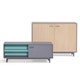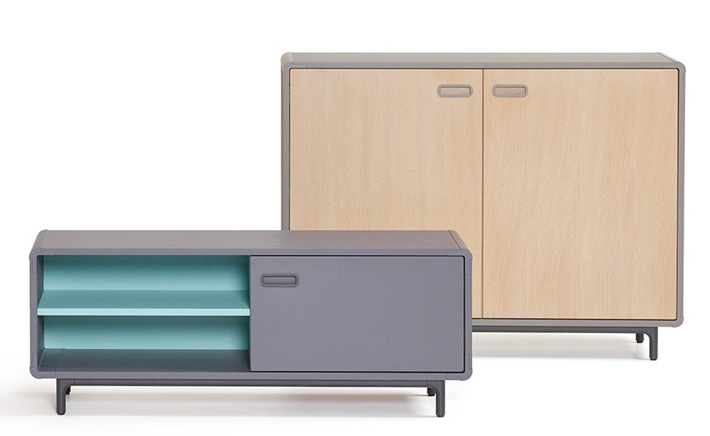 Extens is a cupboard based on a principle of construction that uses advanced adhesive techniques to join aluminum corner elements to wooden panels. This is what gives the Extens its unique, exciting, strong appearance.The Extens is finished with a coating or veneer. The base and handles are made of polished aluminum.
