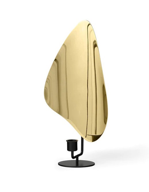 Inspired by French modernist lighting fixtures and designed to resemble a flickering flame, Flambeau is a sculptural design with playful presence. The metal backplate magnifies and reflects candlelight to create intriguing shadows and beautiful ambience.