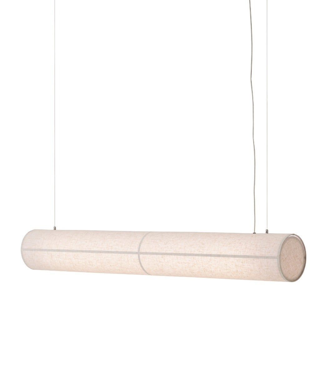 Designed to bring serenity and sophistication to a space, ideal over a dining table or desk, the Hashira Linear Pendant Lamp redefines the popular lighting collection with its horizontal form, delivering ambient lighting in a minimalist aesthetic. The streamlined lamp appears to float on air, suspended from the ceiling by wires and its raw linen shade held in place by magnets, eliminating the need for bulky screws. The dimmable, replaceable LED light source emits a warm glow, bright enough for tasks yet subtle enough to add ambience.