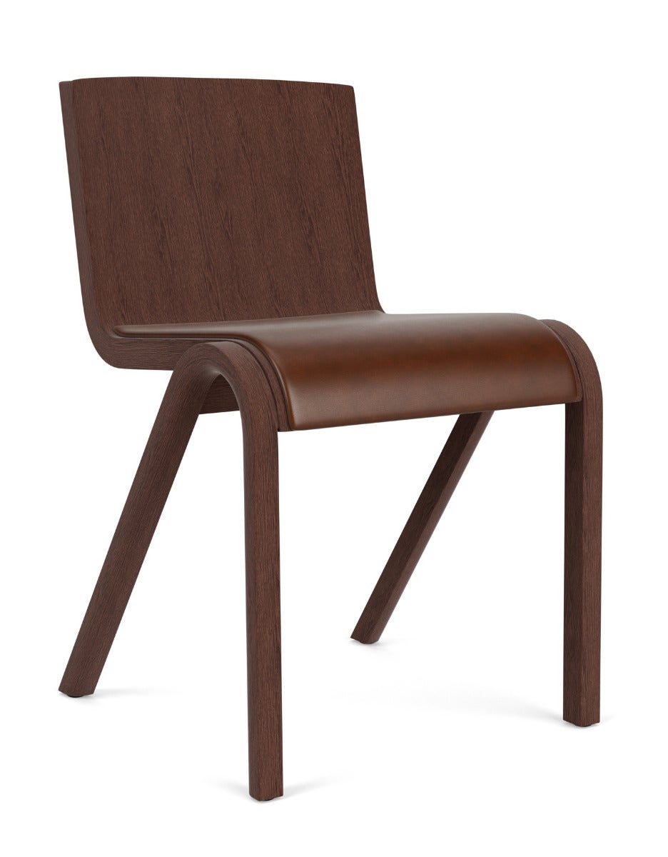The result of a study of the possibilities of form-pressing techniques, Ready Chair, created by Matias Møllenbach and Nick Rasmussen, takes its cues from classic free-swing chair designs, its cantilevered seat and backrest appearing as if suspended on air. Available in FSC™-certified oak veneer, it comes with a natural or red stained oak finish and with the option of an upholstered seat and back. Perfectly sized for use as a dining chair, its stackable design and row-connecting feature make it equally suited to a multitude of other uses.