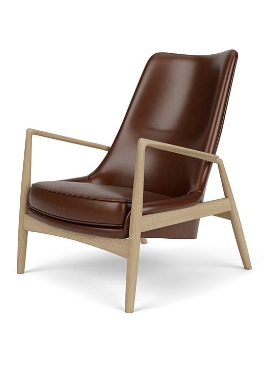 Arguably one of Ib Kofod-Larsen's best-known designs, The Seal is an elegant armchair typical of its time – and yet entirely timeless. The angled frame and armrests and leather upholstery put comfort at the fore, inviting lounging. And despite being made of heavy materials, it has a lightness to it; the shell appears to float inside the wooden frame. Named after the Swedish ski resort, The Seal is a fine example of Ib Kofod-Larsen's organic design and focus on detail and comfort.