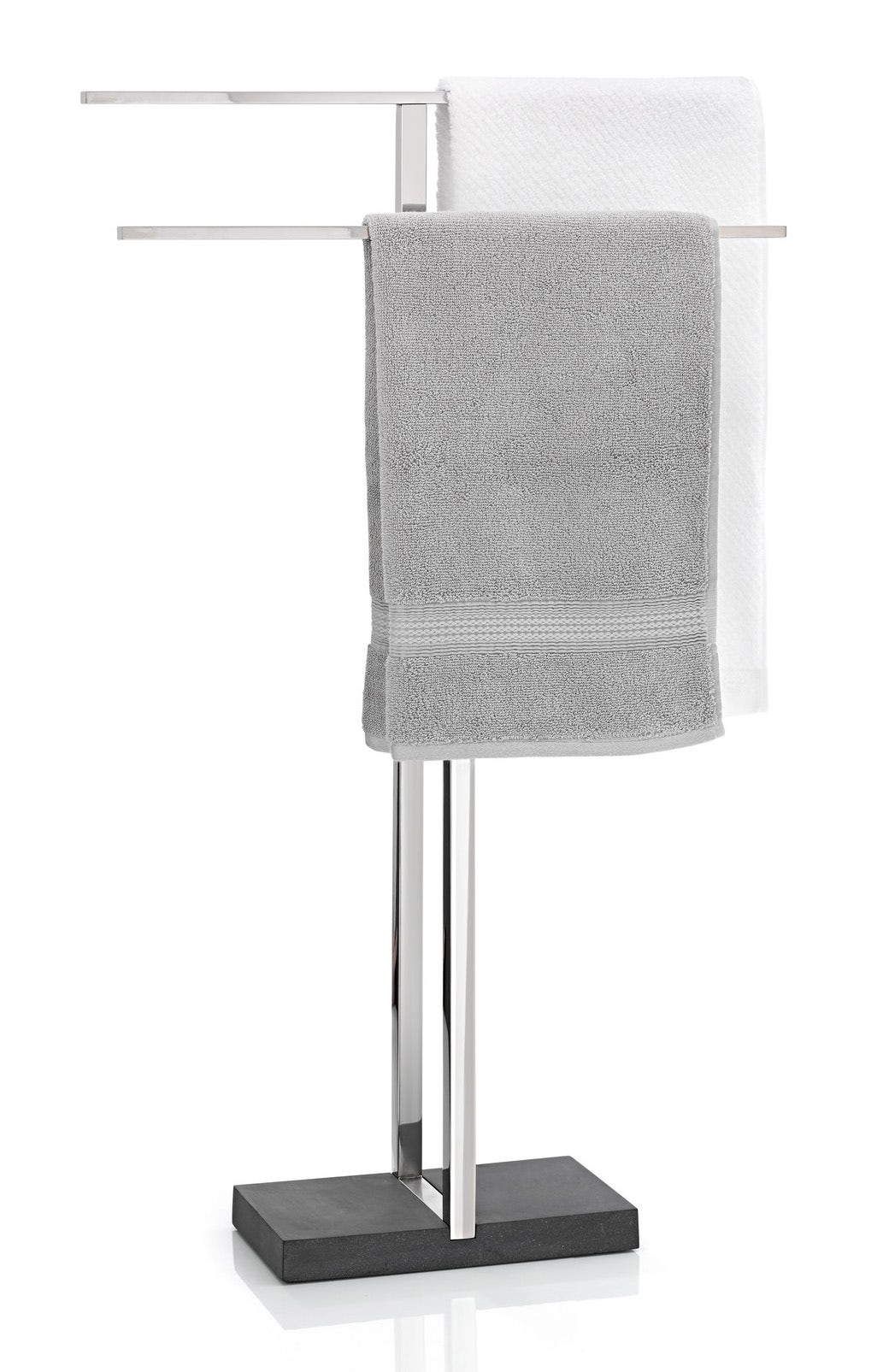Stainless steel blomus Free Standing Towel Rack - Polished with polystone base. The dark, heavy polystone base offers a firm stand and adds elegance to this towel stand. Great solution when wall-mounted towel rails are not an option. Bottom rail is 4'' lower than top rail.