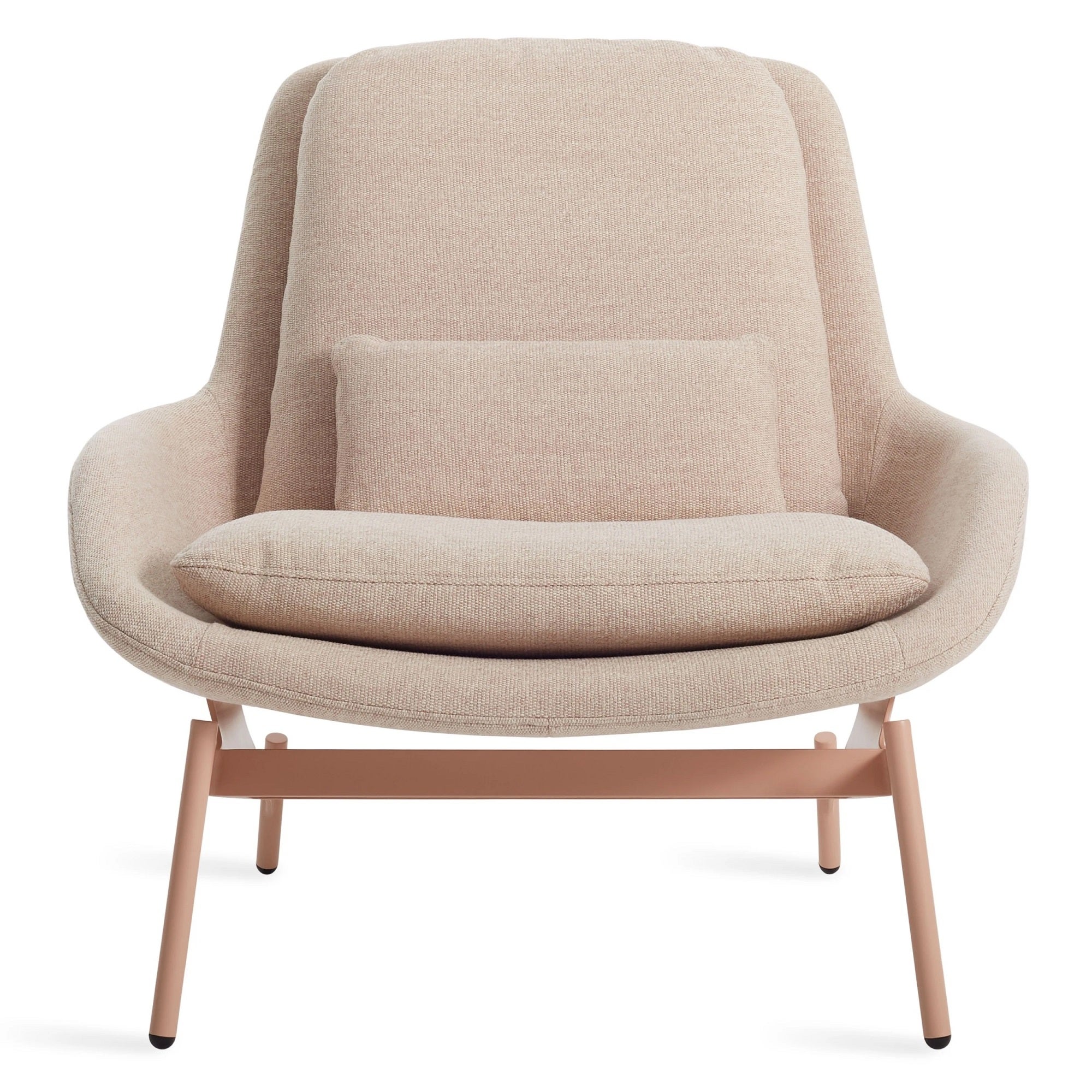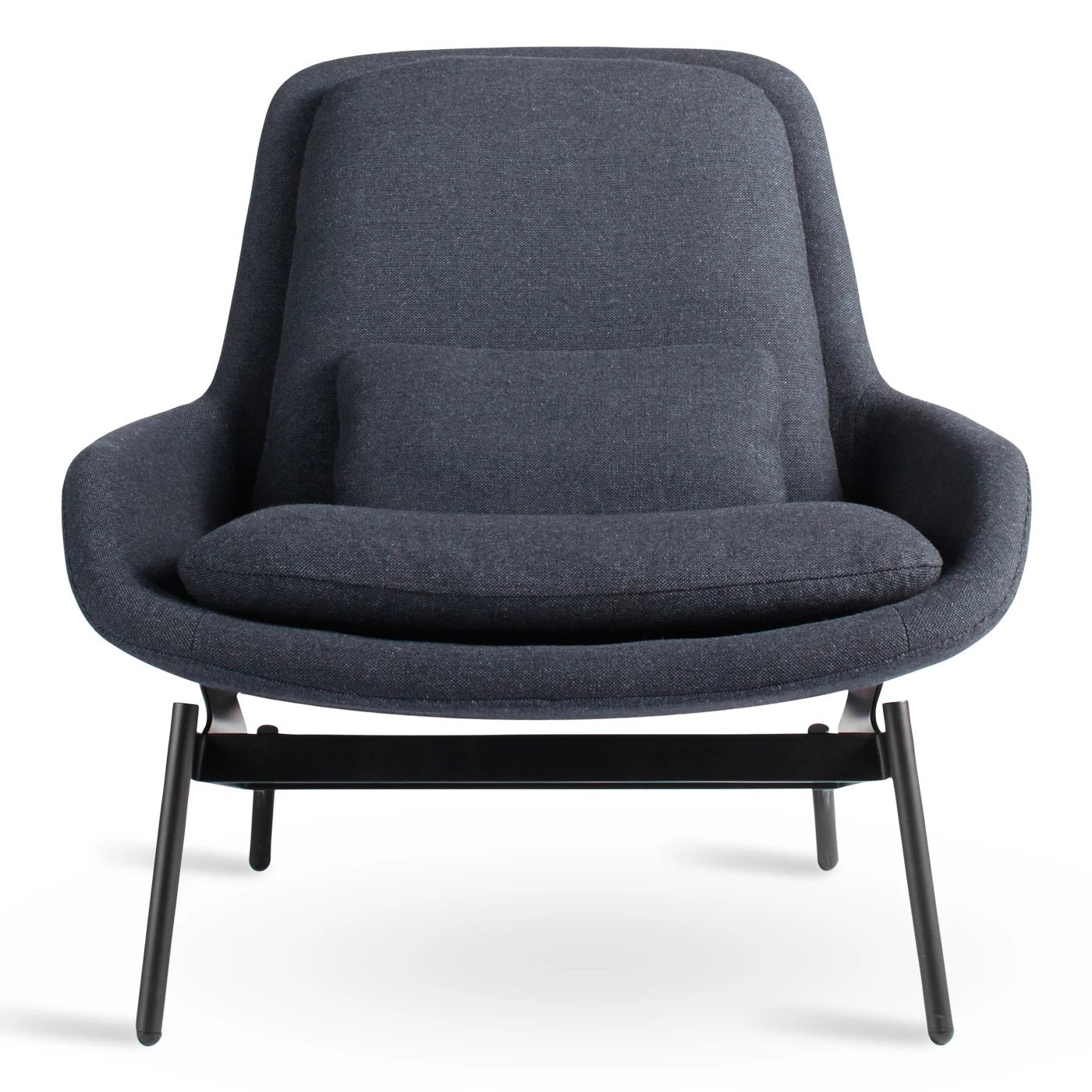 Shapely curves, a gentle recline and “just-right” cushions invite the lost art of unwinding. A sculptural powder-coated steel base sets up the striking profile.