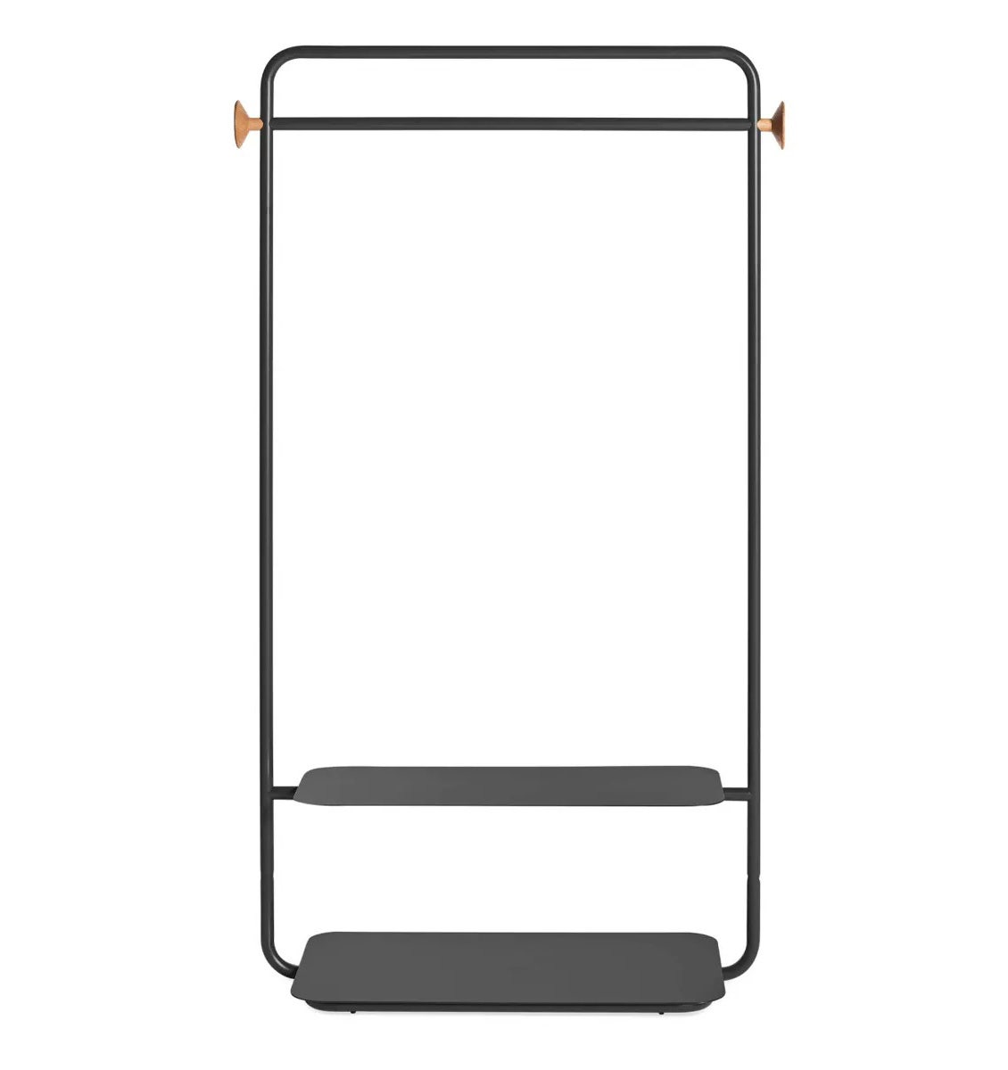 Show your clothes a good time. Garden Party is the perfect storage for people who have no storage. Durable powder-coated steel rack and shelves create a clean and quiet spot to stage outfits or showoff your full regalia. Solid white oak knobs provide an extra spot to hang accessories. Pair with Garden Party Shelving System and Storage Box for the closet of your dreams.