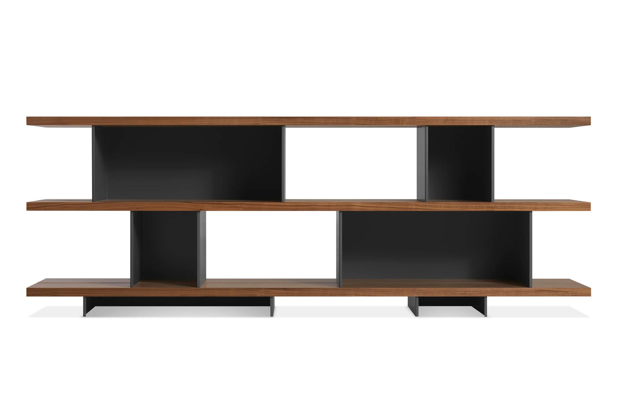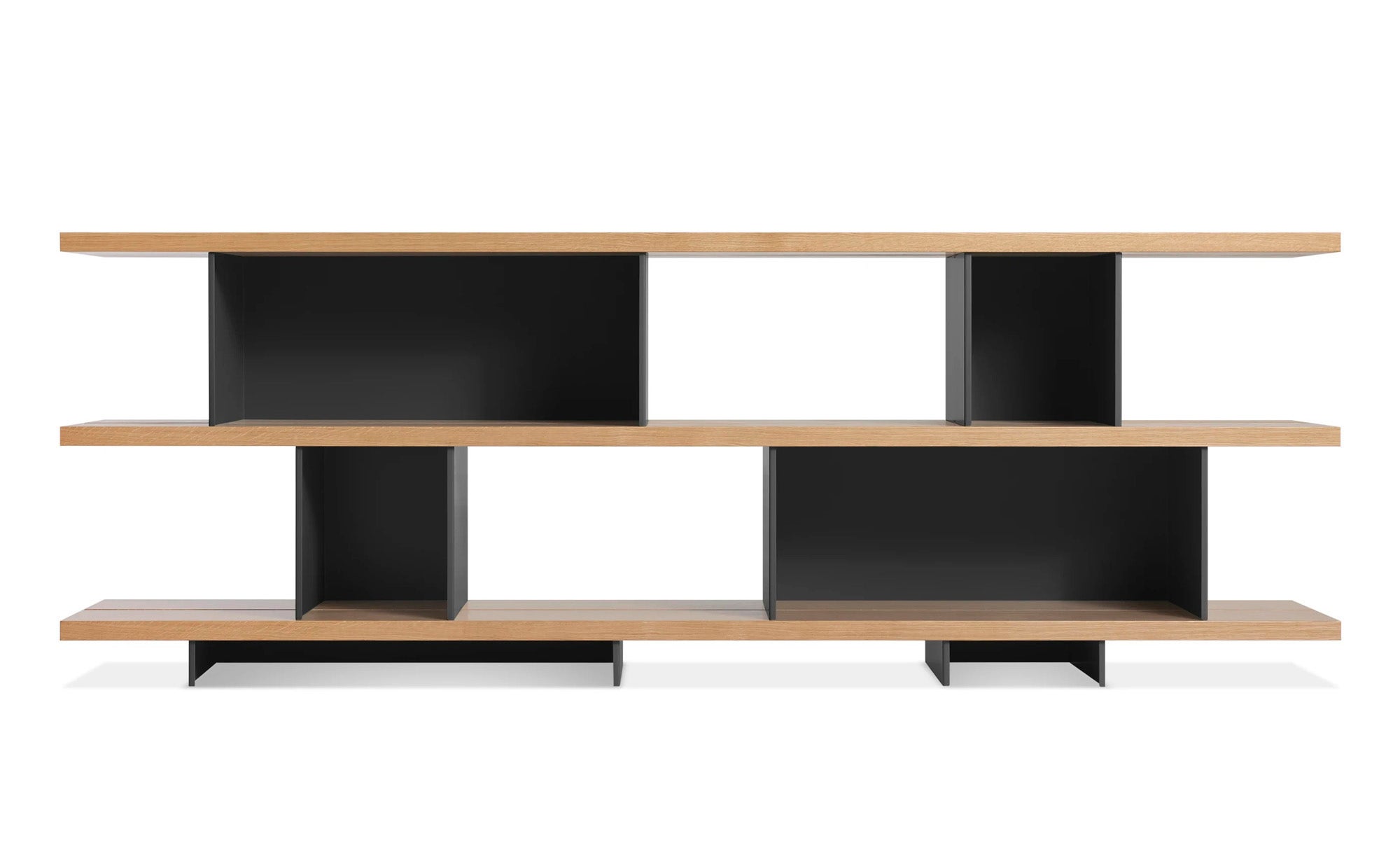 Wood shelves and metal blocks stack without the need for hardware forming beautiful voids and cubbies to house all things in a perfectly curated manner. Two widths of foot and shelf blocks celebrate asymmetry while bringing stability and visual appeal.