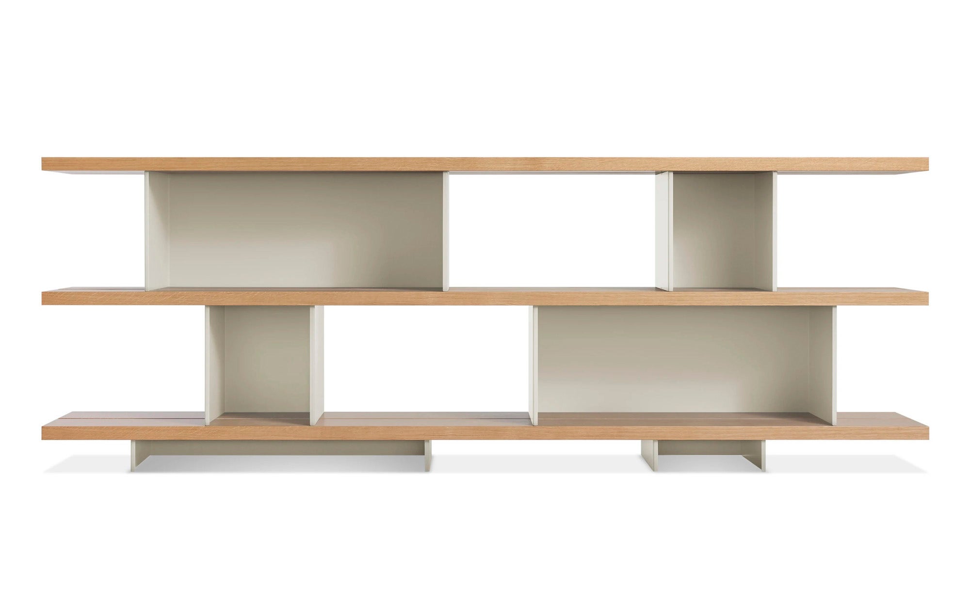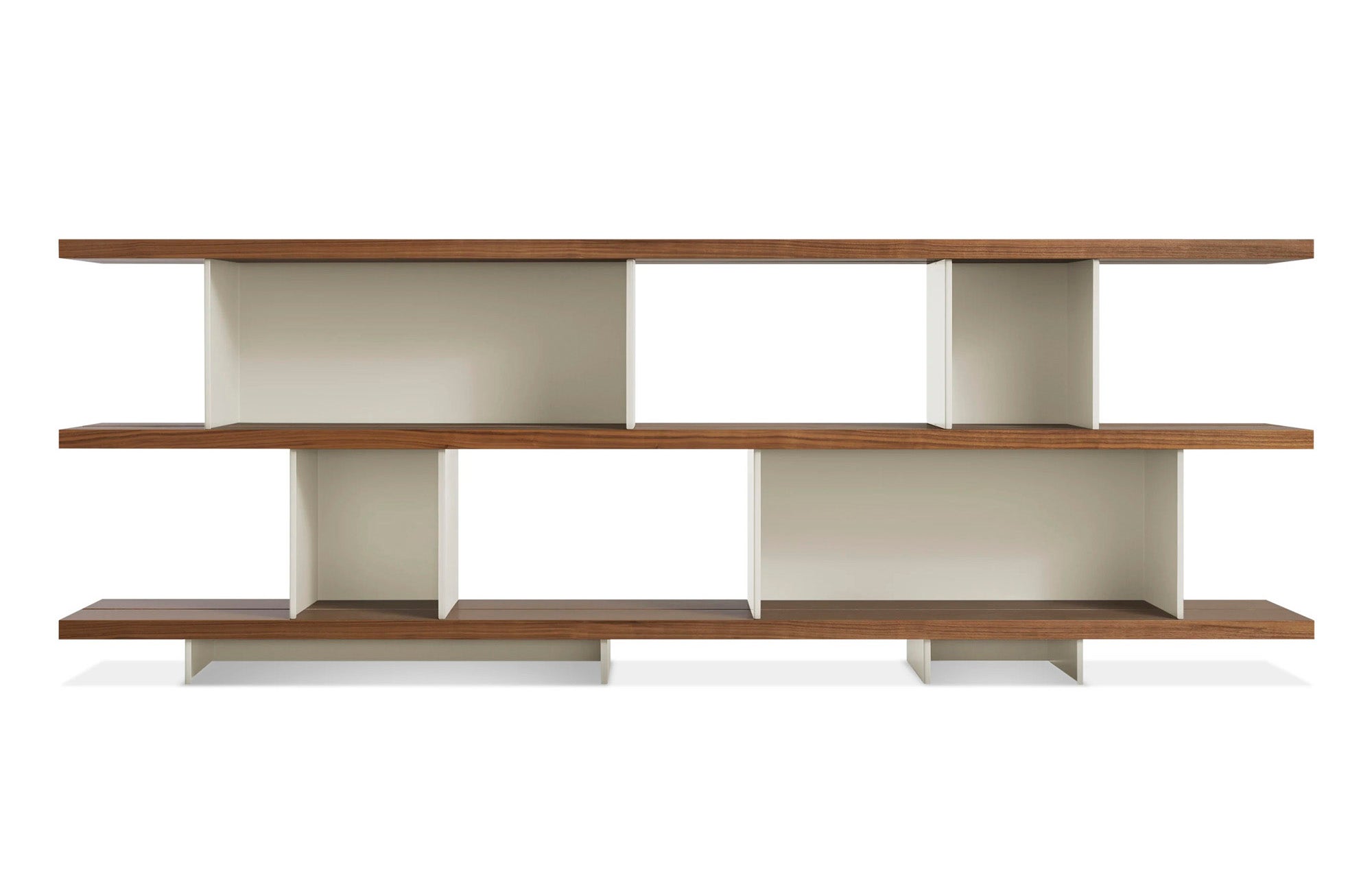 - Wood shelves with white oak and walnut