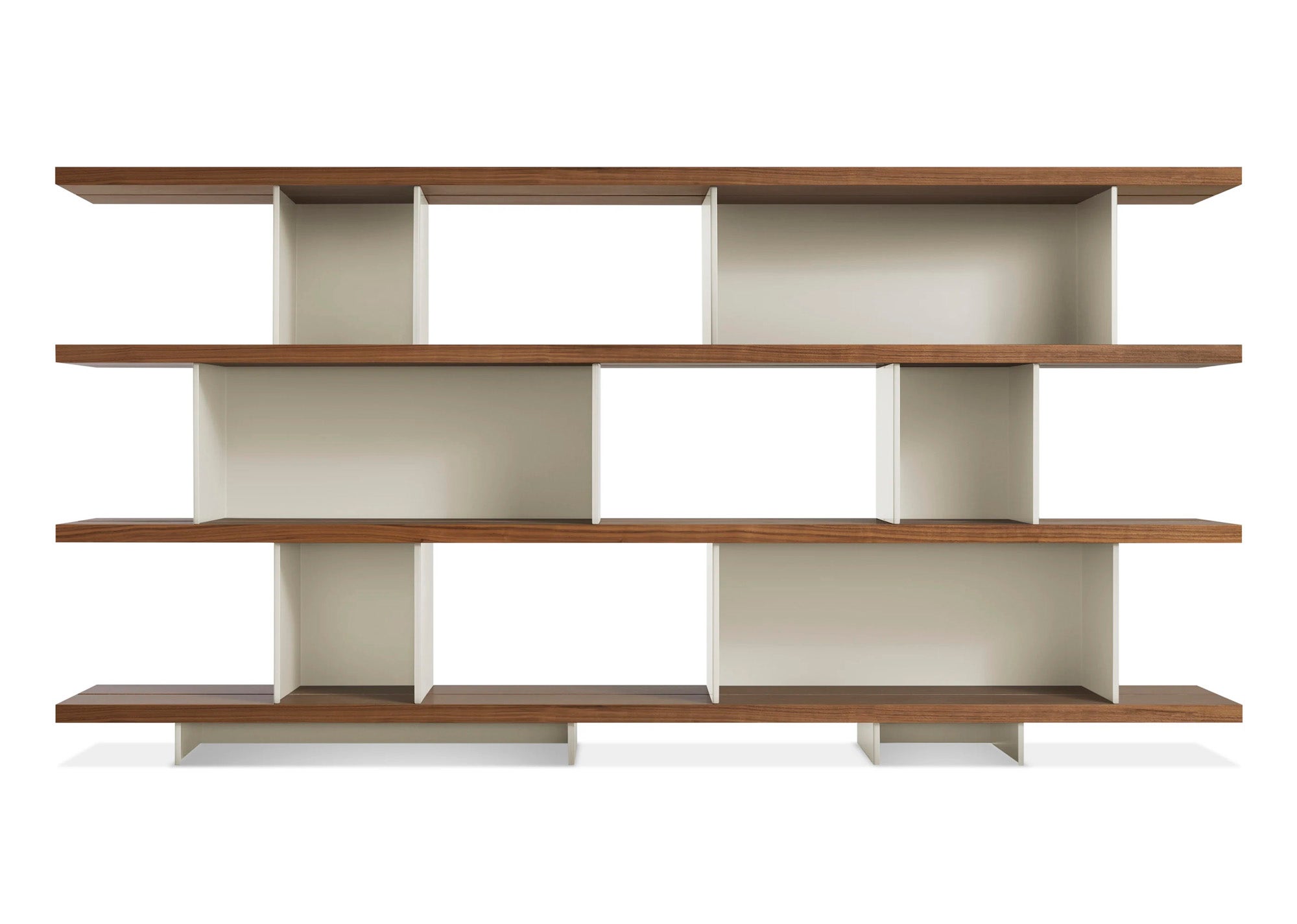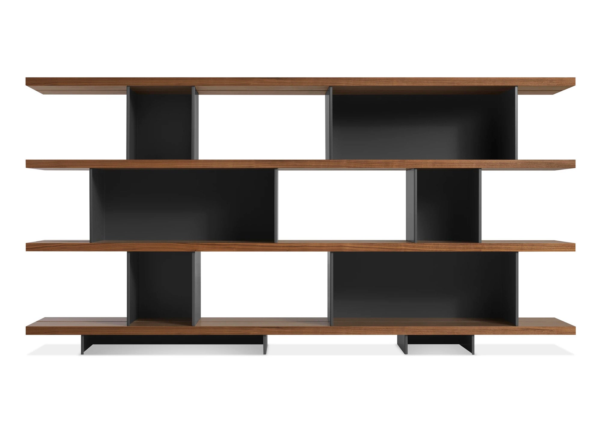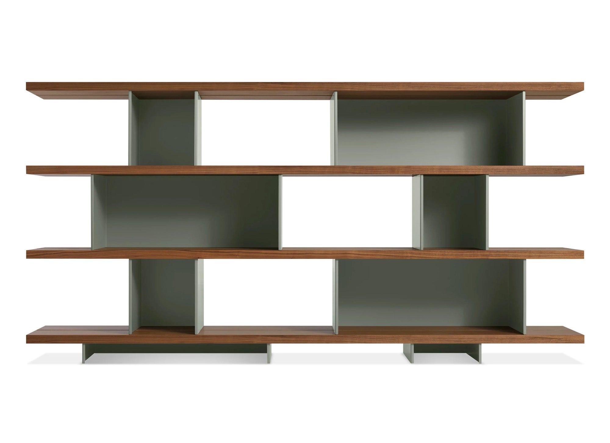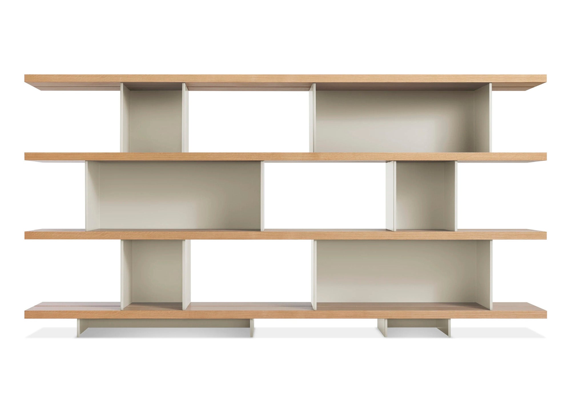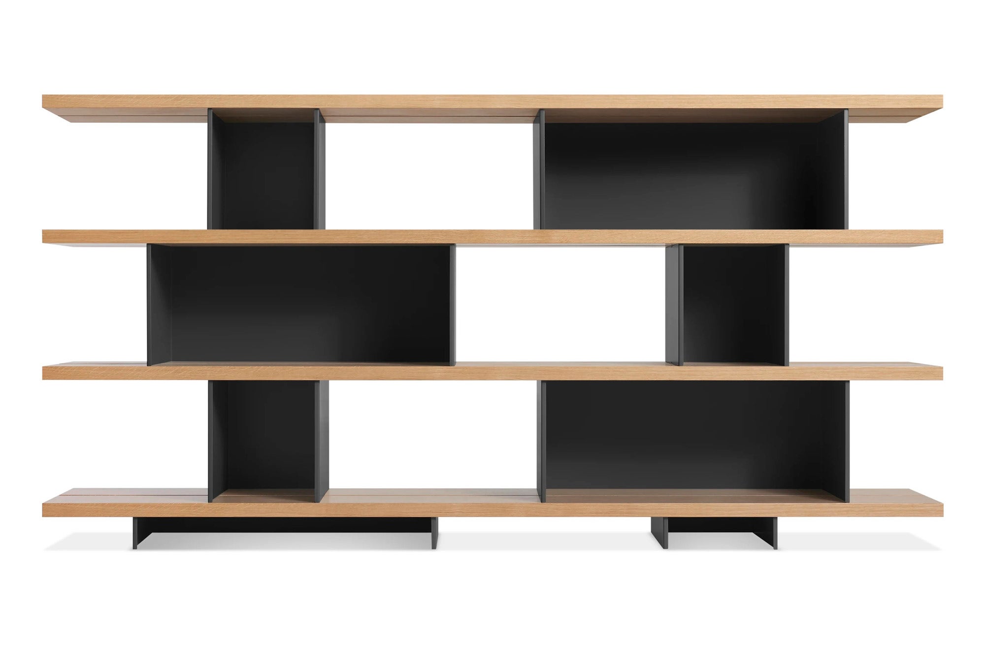 Wood shelves and metal blocks stack without the need for hardware forming beautiful voids and cubbies to house all things in a perfectly curated manner. Two widths of foot and shelf blocks celebrate asymmetry while bringing stability and visual appeal.