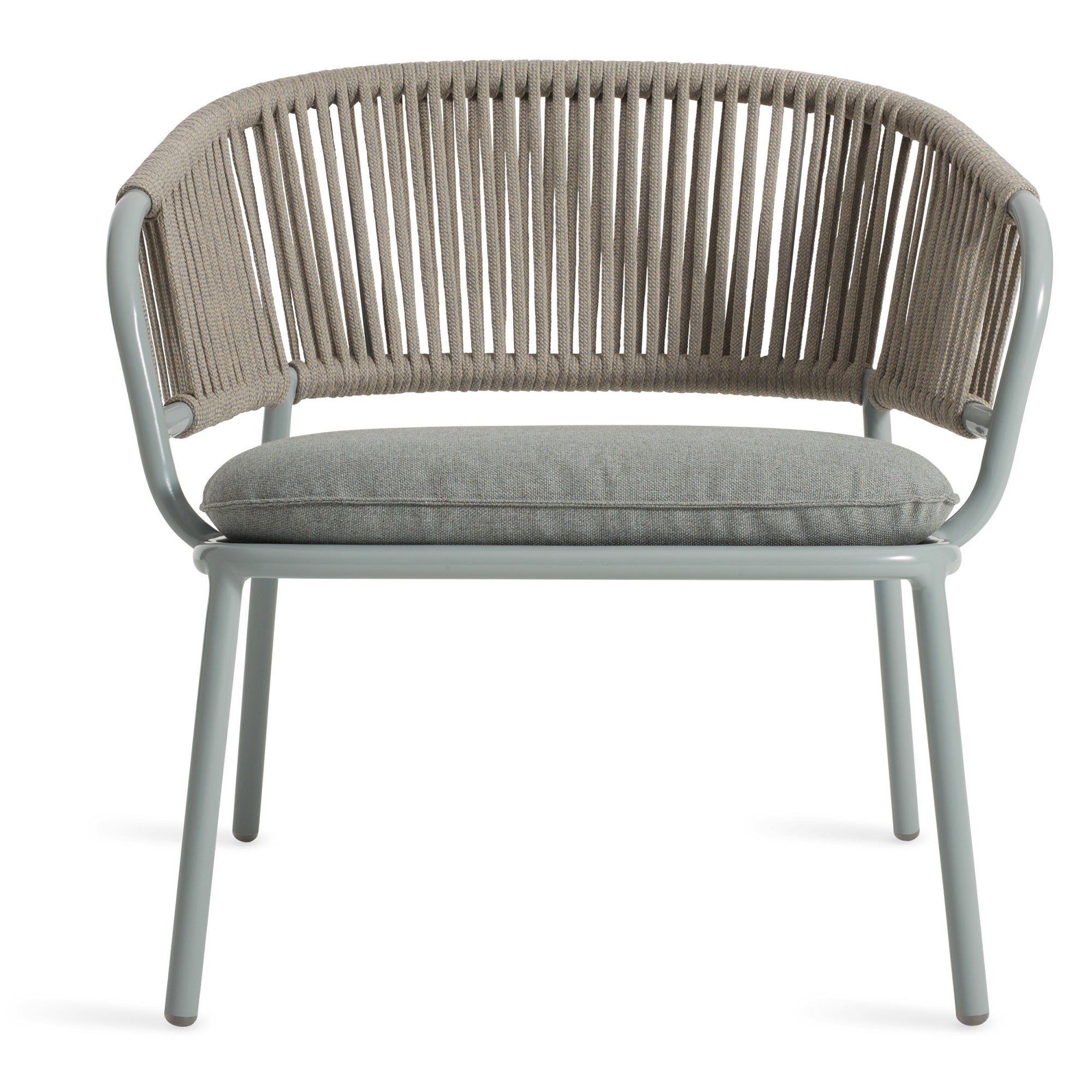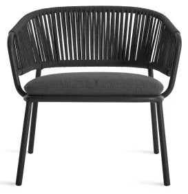 Woven all-weather rope wraps a tubular aluminum frame to create a balance of texture, comfort and resilience. The Sunbrella upholstered seat cushion is UV and mildew resistant. Proportioned for relaxation.