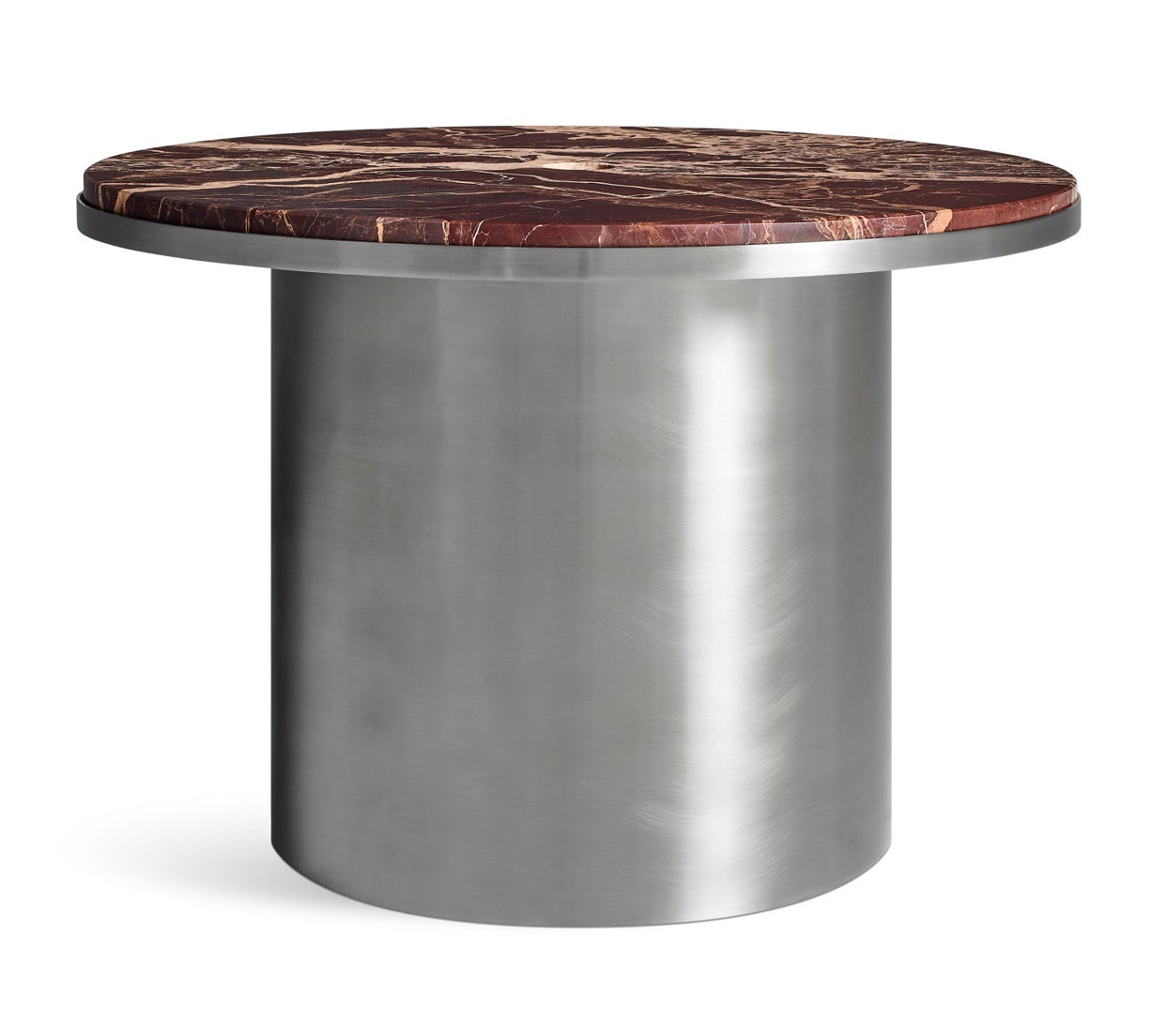 A polished wheel of Carrara marble sits on a tidy steel base for an effect that is loaded with low key elegance. Curious center hole provides visual interest and prompts casual conversation.