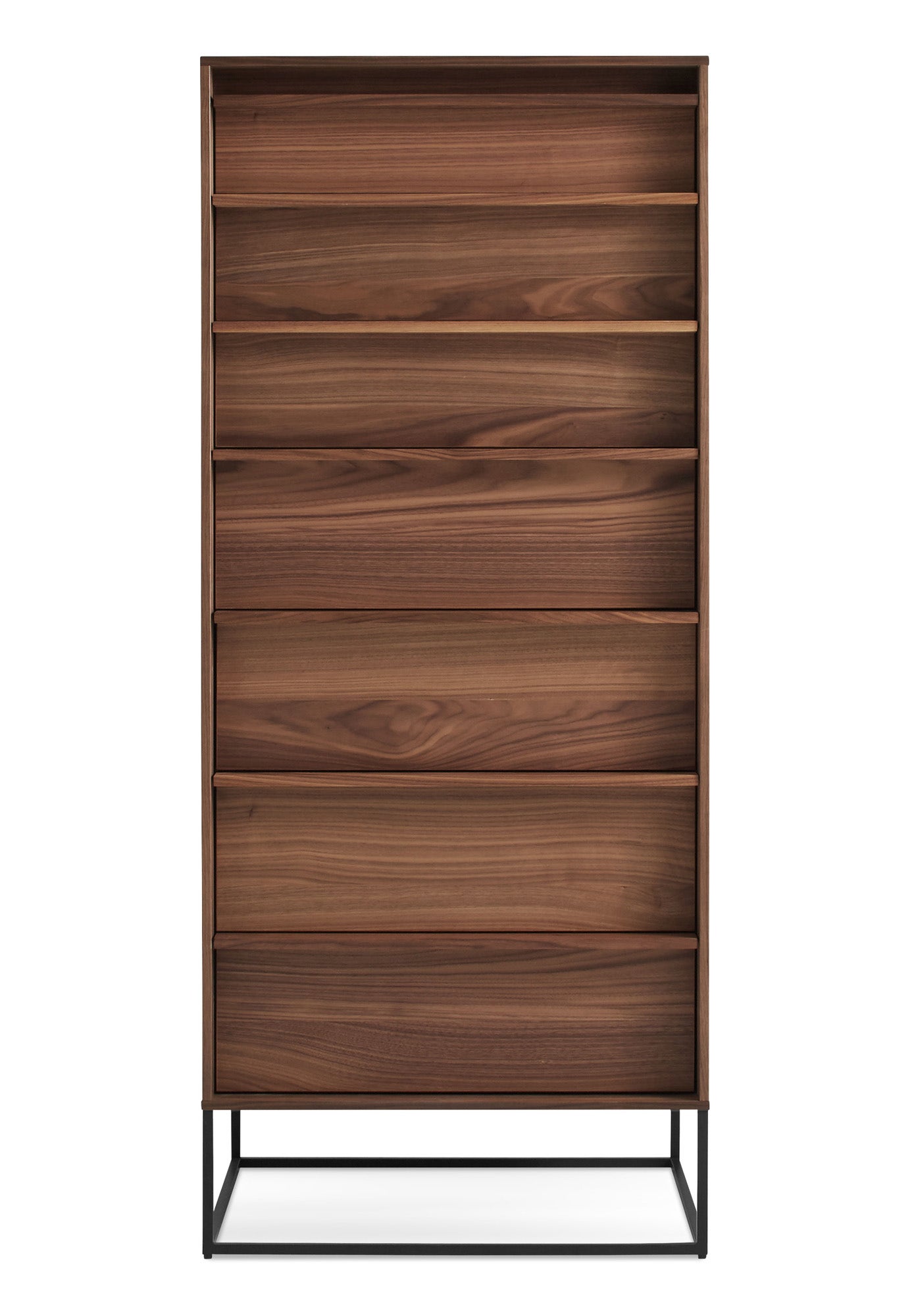 The Rule Collection serves up well considered planes and angles that are ready to slay clutter in any room. Deep set drawer fronts, detailed by a wood pull, reinforce the linear design and create a seductive shadow line. Dusk-colored drawer and door interiors provide a surprise dose of color while a square steel base ties it all together to form an elegantly, uncomplicated form. Available in six shapes suited for any room in the home or office.