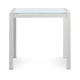 Modern outdoor table designed with crisp minimal white powder-coated aluminum and tempered sandblasted glass. Clean lines designed to weather the elements.