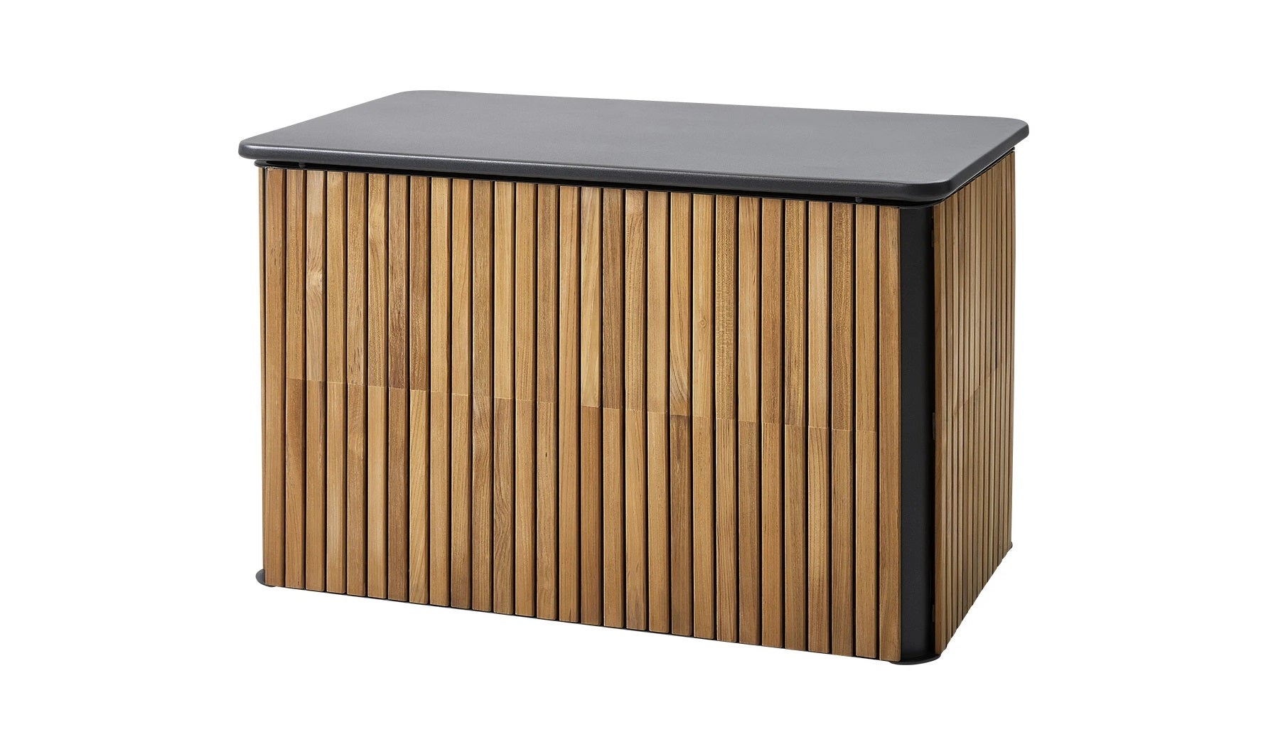 Combine is a functional and spacious box in black powder coated aluminum and slats in certified teak. The combine box is a perfect storage solution for your outdoor environment, for storing your cushions, when the weather changes. The warm certified teak and the streamlined powder coated aluminum gives a unique look that fits in most spaces. Cane-line teak is approved and cultivated according to SVLK certification system. The powder coated aluminum ensures a resistant surface to knocks and scratches. The Combine cushion box is despite its size, rather light in the material, and with a lid with soft-closing for your comfort.