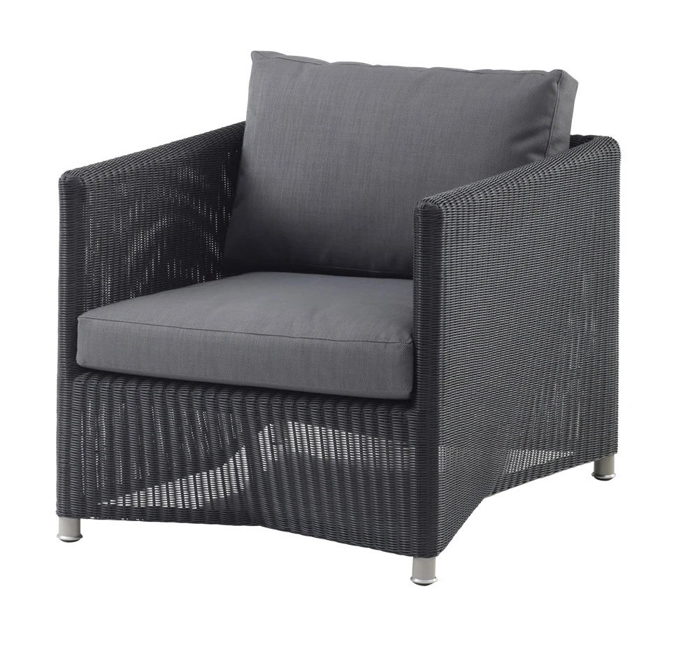 The Diamond lounge chair with a luxurious Cane-line Natté cushion in grey excels in both design and comfort. Similar to other Diamond Lounge items, the Diamond Lounge chair is designed by Foersom & Hiort-Lorenzen MDD, a fact that is mirrored in the minimalistic design and subtle colour of the materials. Due to the high quality of the material and graphite weave, the Diamond Lounge chair can be left outside all seasons, and is low on maintenance.