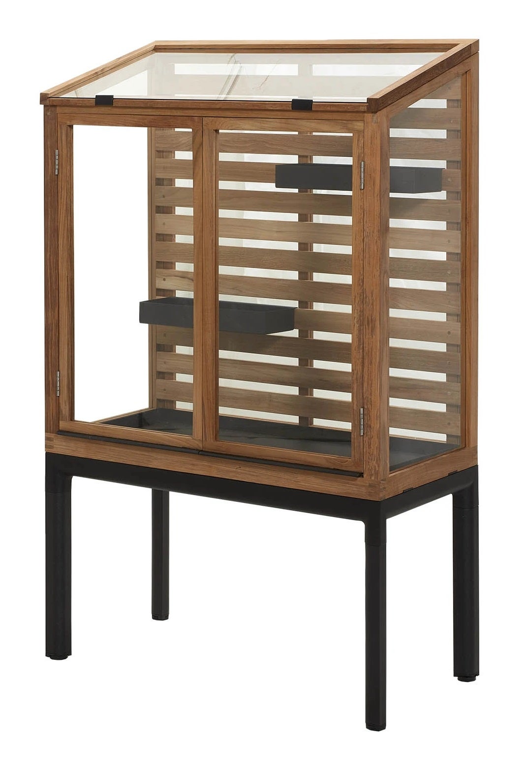 The Drop greenhouse is designed by the Cane-line design team, and is part of the Drop collection, which consists of an outdoor kitchen concept and a selection of outdoor dining tables. The frame of the series is made of specially designed profiles that ensure a strong construction and an elegant finish. The series is inspired by a drop shape, which provides a profile with both edges and soft curves. The greenhouse is made with a frame in warm teak with glass panes, with two doors so you can easily organize your favorite herbs and vegetables. Cane-line teak is approved and cultivated according to SVLK certification system. With the Drop Greenhouse, you get two practical movable shelves where your greens can be placed. The top of the greenhouse is easily clamped open to create air circulation for your plants, ensuring optimal growth conditions.