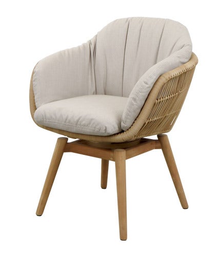 The Stay outdoor dining chair designed by Cane-line Design features a generously curved, nest-like shape that offers a cosy inviting embrace, perfect for relaxation. Its handwoven shell, made from durable Cane-line Weave®, showcases an open wicker pattern, creating a light and airy feel while ensuring UV resistance for long-lasting durability. Resting on a solid teak base with a smooth swivel function, the chair allows effortless movement without compromising stability. The plush cushions, designed with QuickDry & Airflow system, provide exceptional comfort and dry quickly after rain. Combining natural elegance with modern functionality, this chair is ideal for those seeking both style and practicality in their outdoor space.