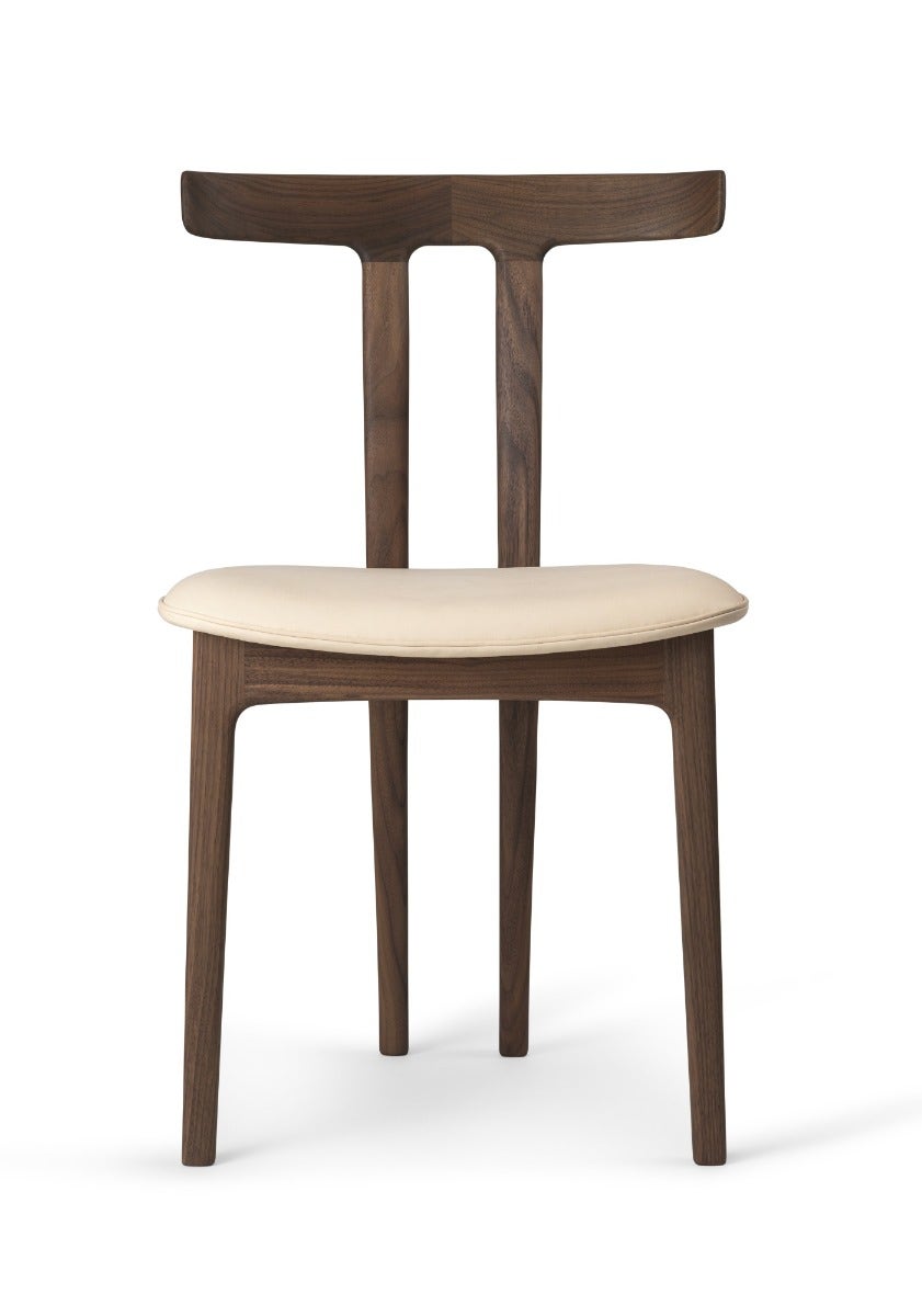 The result of careful processing and many carpentry hours to achieve smooth transitions in the sustainable wood joints, the chair’s most striking detail is the T-shaped backrest which merges seamlessly with the tightly placed back legs, giving the chair a three-legged appearance. Despite its light expression, the T-Chair has a wide, upholstered seat that provides excellent comfort, making it ideal for dining use.