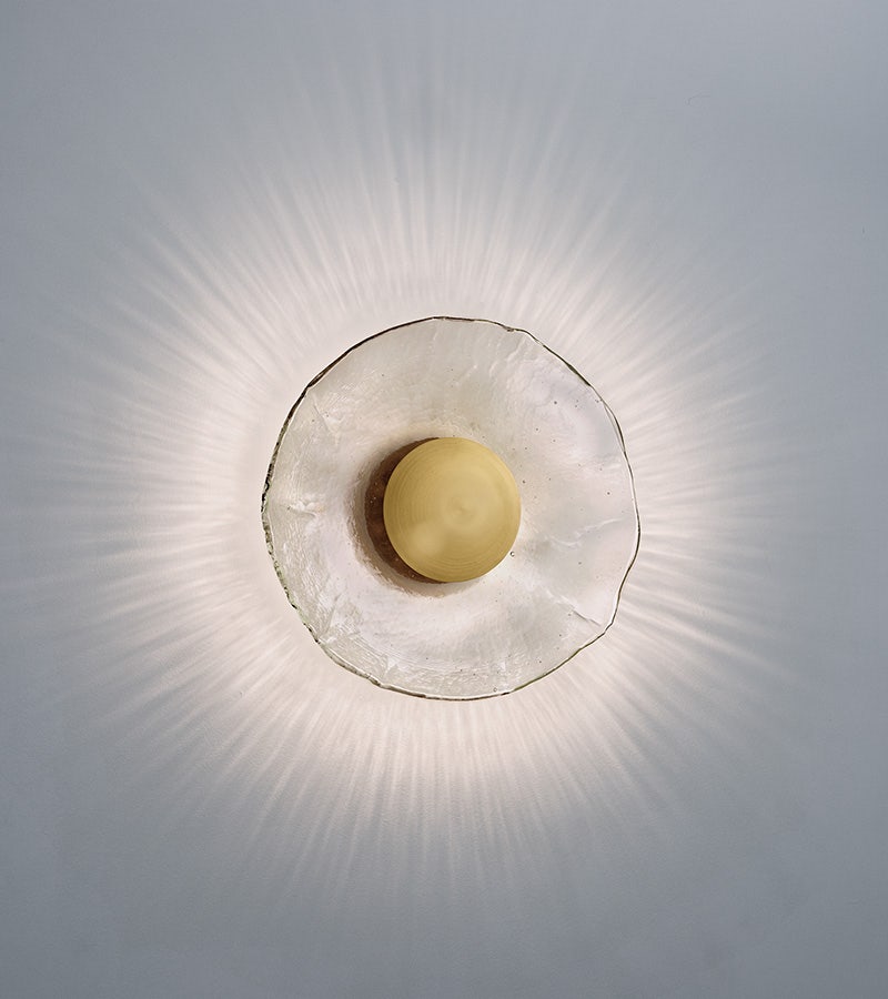 Unpredictable beauty. Light and glass work together to create unimaginable results. When the glass cools, a unique, almost fingerprint-like pattern is revealed, producing a mesmerizing sunburst effect on the wall when the light is on. The Inviso sconce from Cerno uses a palette of familiar wood, metal, and glass with a form that blurs the lines between art and utility.