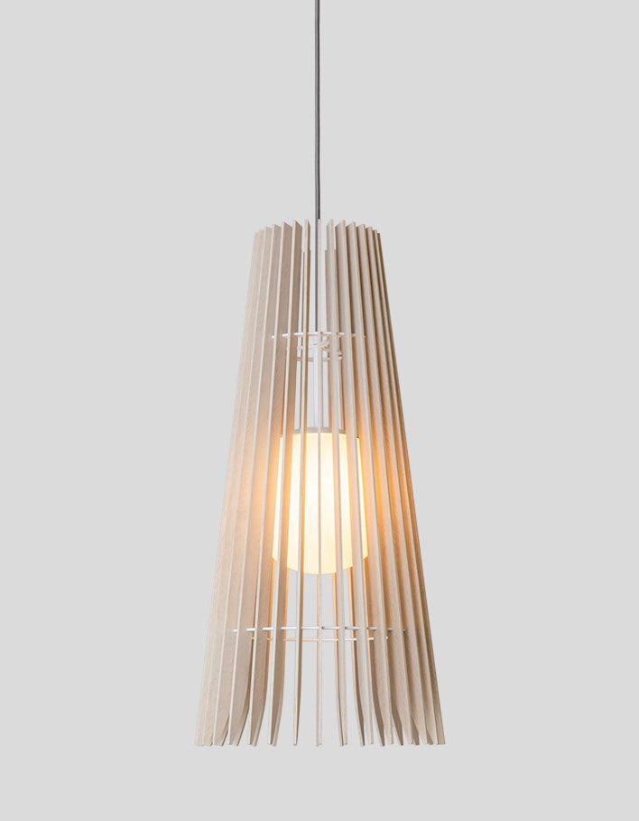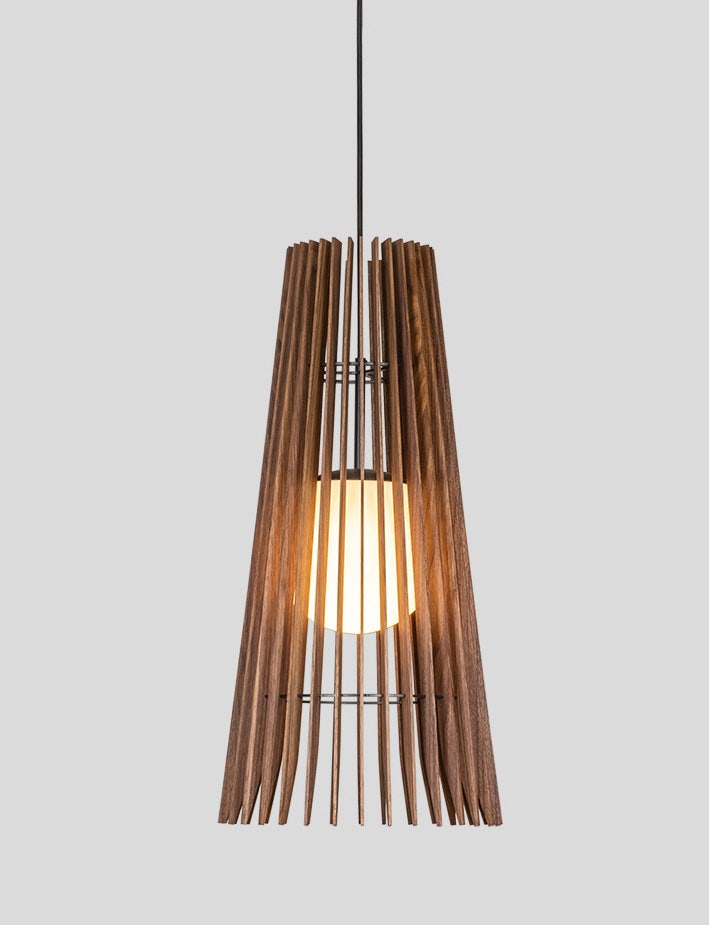 Lex in Latin is defined as Law, Principle, or Condition. Simple architectural principles guided the design and construction of the Lex pendant. Three primary parts, the light, the hubs, and the wood slats, compose the form, function, and feel. The laws of attraction are often mysterious, and Lex's ability to appear both solid and porous simultaneously creates a sense of intrigue and freshness.
