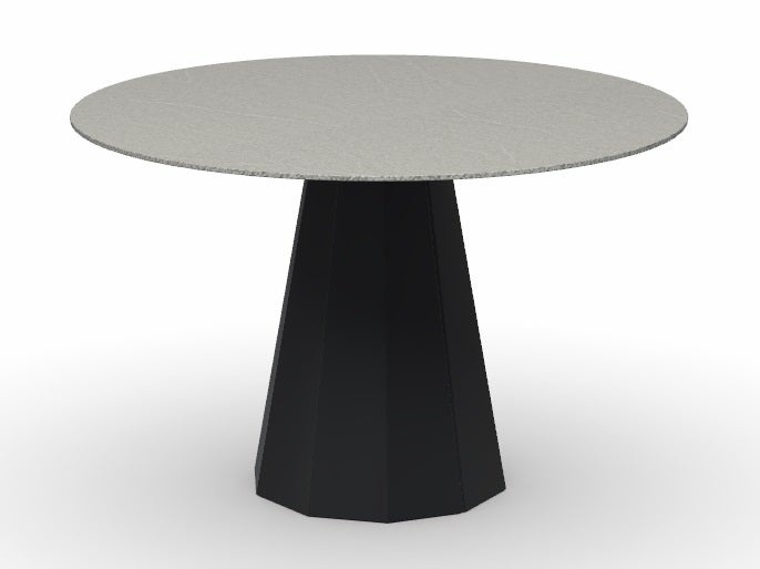 DIX non-extending round table set on a ten-sided conical pedestal base made from coated faceted sheet-metal. Endowed with a leveling foot concealed on the inside, making it suitable for any kind of flooring.