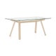 Peeno is an exquisite architectural creation of intricately interlocked pieces of wood. The various parts interweave to create a non-extending table upon which rests a rectangular top made from transparent tempered glass.