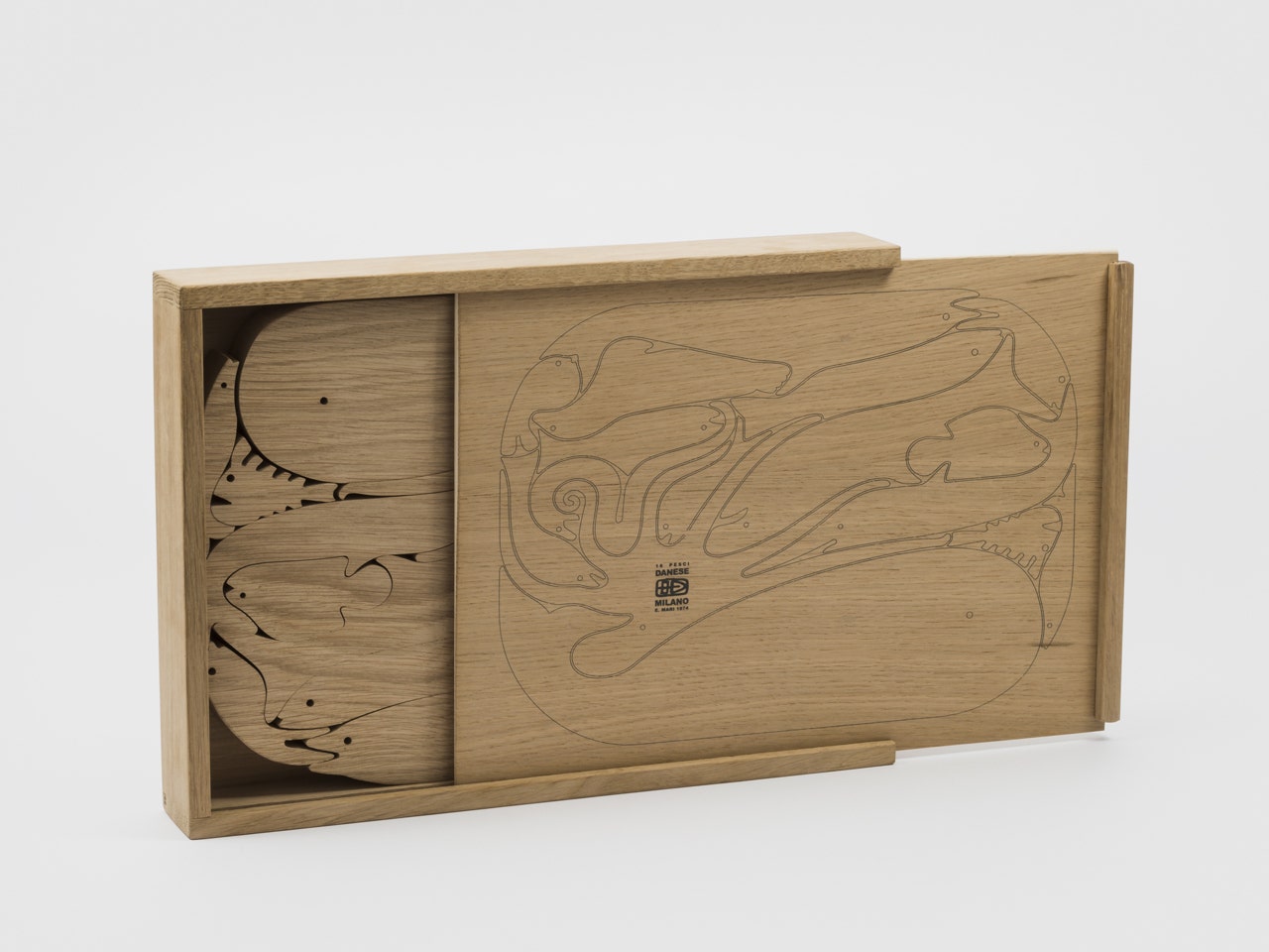 16 pesci is a wooden puzzle, cleverly designed to produce 16 different fish shapes, with just one continuous cut, from a single piece of wood. It is one of the most famous examples of design applied to the field of didactic objects.