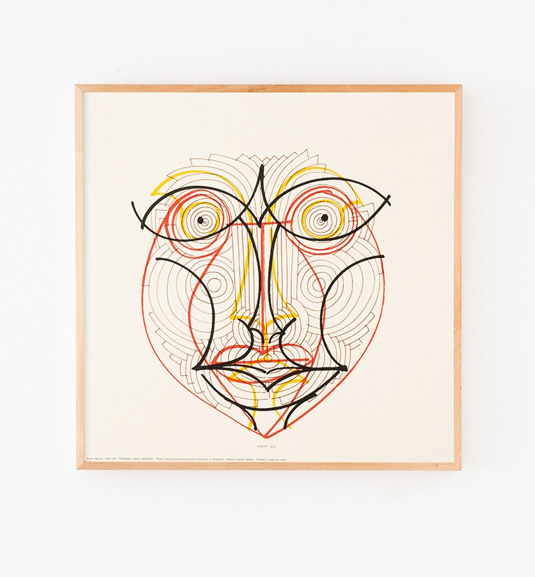 Presented in 1970 as a box set of six small color screen prints, the series of La presenza degli antenati is now edited in a 70x70 format. The face, with its expressions and characteristics, becomes the subject to express a graphic research between rigor and fantasy. Bruno Munari, who defines himself as an “inventor of signs”, ironically highlights the characteristic features of the different faces shaped by time in a graphic synthesis that is expressive education.