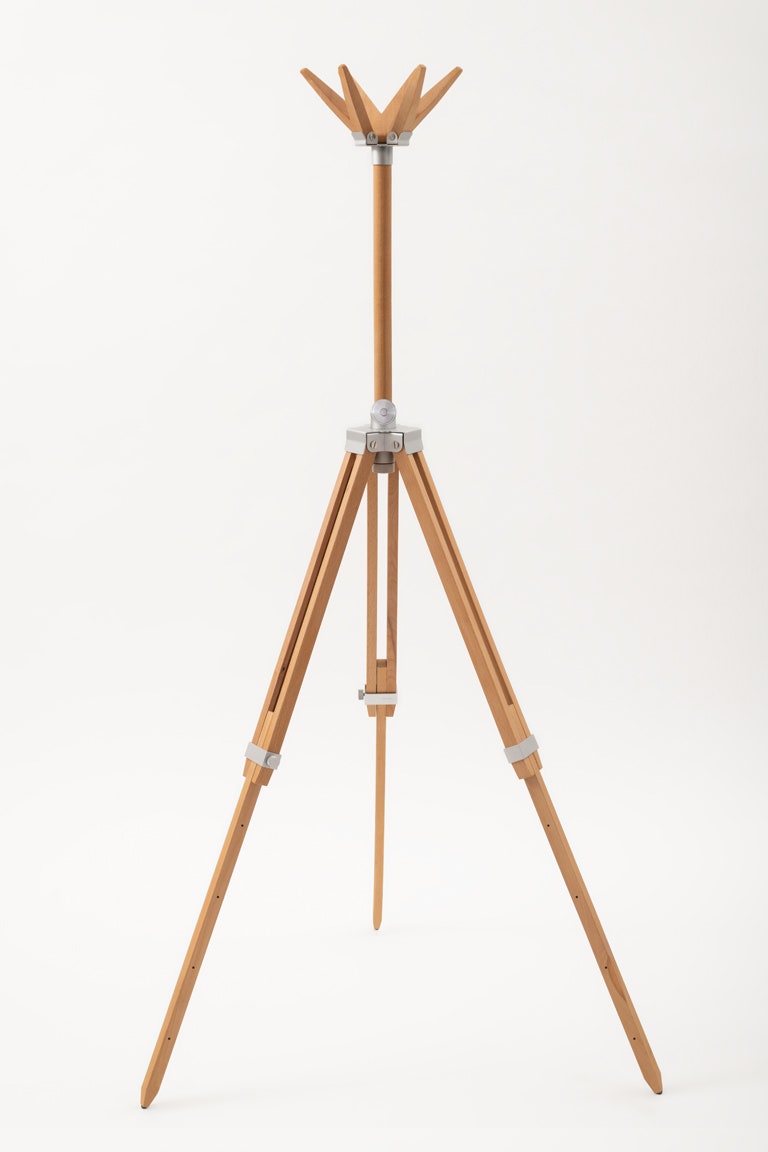 The wooden structure inspired by an artist’s tripod supports a top, which can be either rectangular or round, or the body of the coat stand with six hooks and an umbrella stand. Five different heights to offer practicality and freedom of use: a laptop rest, a pedestal or a serving table.