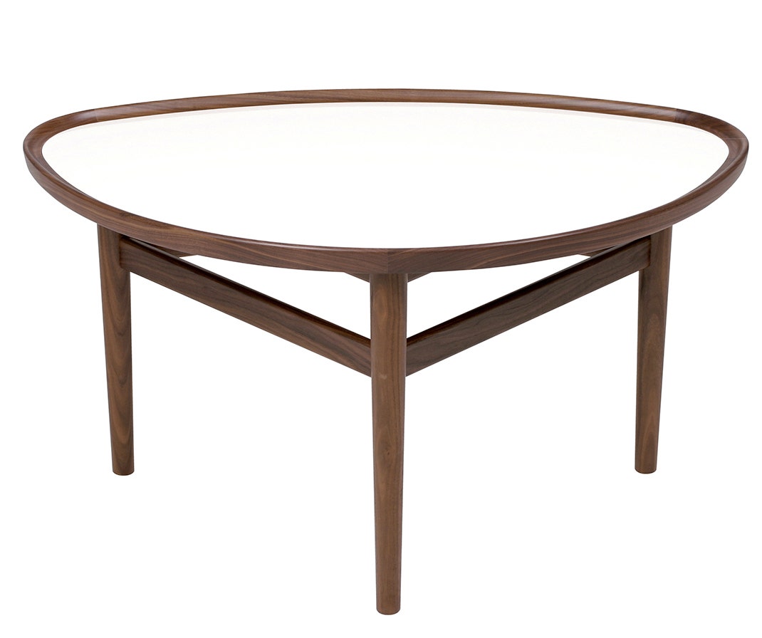 This eye shaped, three-legged table was originally designed to match the 46 Sofa. The shape of the table fits perfectly with the curve of the sofa, and hence creating a design unity between the two pieces. The Eye Table was designed in 1946 for the sofa FJ 4600. At that time Finn Juhl was very much inspired by modern art especially by Picasso and Henry More