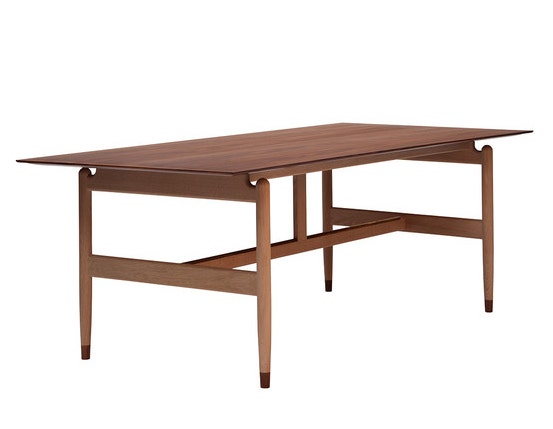 The Kaufmann Table was originally designed for Finn Juhl’s own home, just like many other of his iconic designs. The table is in a league of its own with an unusually refined edge profile that gives the illusion that the table top is floating above the frame. The table is almost entirely crafted by hand and manufactured in oak with a veneered tabletop in walnut with solid edges.