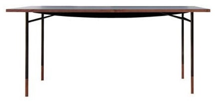 Finn Juhl is known for adding visual lightness to his designs, and the Nyhavn Desk is no exception. The desk is manufactured in different sizes and available with a veneered table top in teak, oak, walnut, Oregon pine or black linoleum, with matching wooden toes on burnished steel legs. Alternatively, the legs are available in black, orange or light blue. The table can be ordered with a tray unit with three drawers in a warm or cold range of colours.