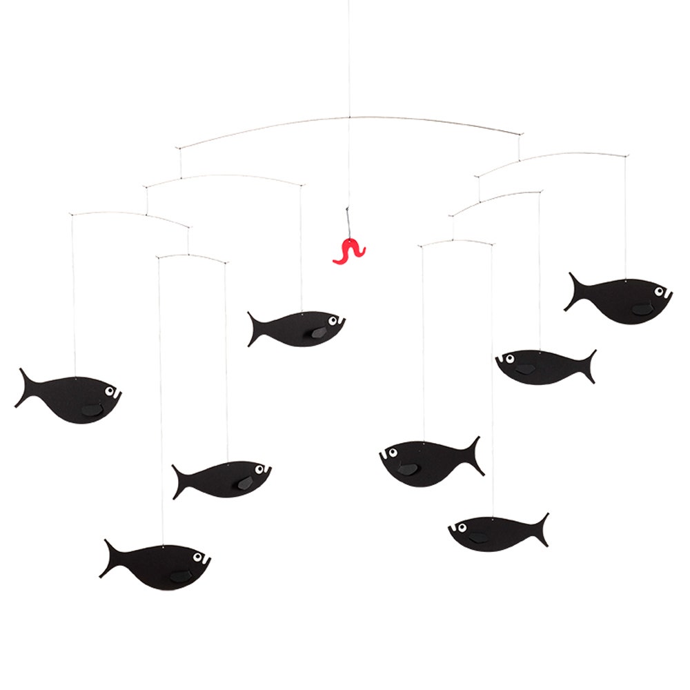 Eight fish move ceaselessly, lured by the bright red worm dangling on a strange hook. But would it be a tasty morsel? A very beautiful and special mobile for a simple and modern nursery.