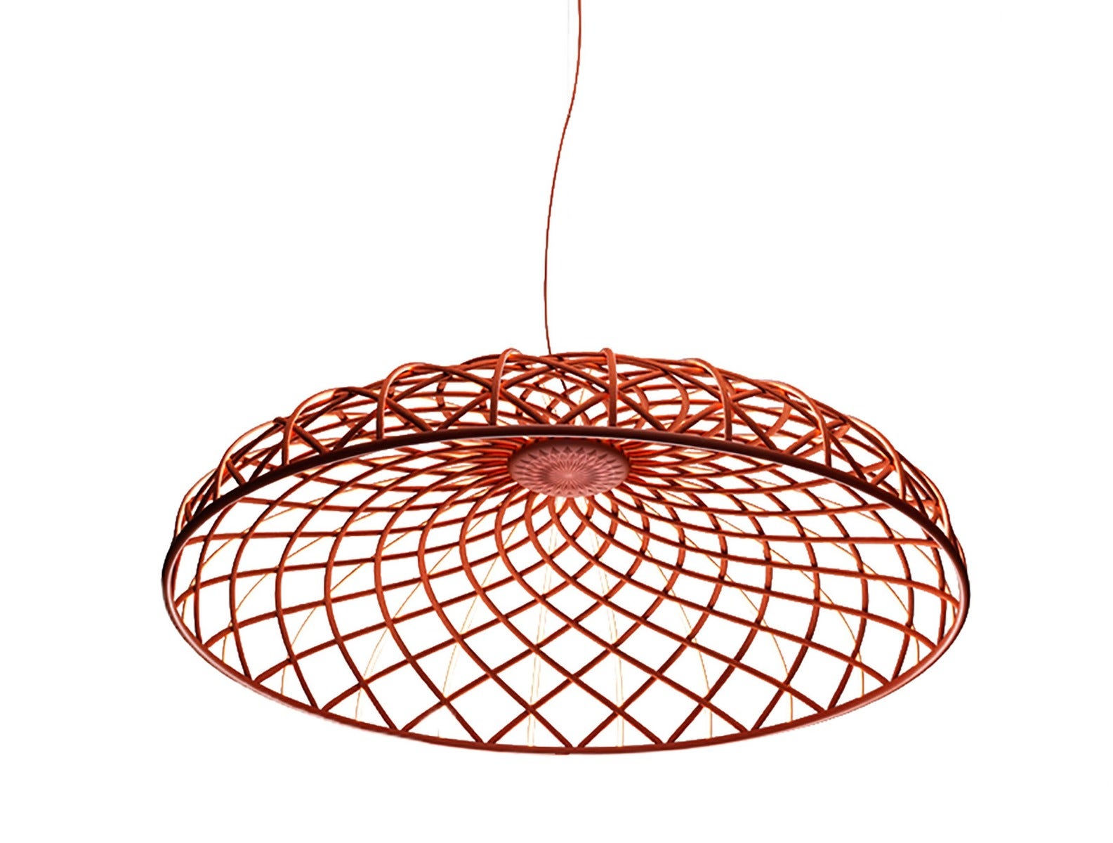 Diffuse pendant light fixture: a combination of luminous and dark elements arranged into a network and formed of core structures covered with a thin interwoven colorful tubular mesh made from recycled and recyclable fabric produced from polyester. Every single luminous element is powered by special micro-connectors located at the top of the dome and is covered with a two-tone mesh, while the side facing the inside of the dome is always white in order to allow for optimal light emission from the LED module. The fixture is fitted with a built-in balancing system at the top of the dome which helps adjust its balance, making it perfectly stable. The bottom of the dome is completed by an aluminum ring that keeps the dome's entire structure in place through a simple snap-fit system. The product is assembled with absolutely no glue so it can be fully separated to be recycled in the future and in case of any future repairs or replacements.