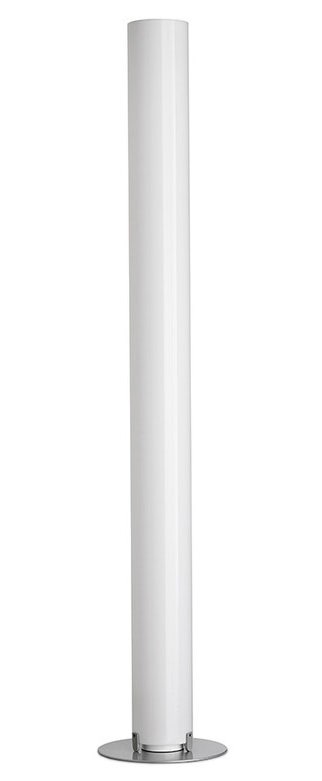 First designed by Achille Castiglioni in 1984, the Stylos floor lamp illuminates with a striking simplicity that is anything but ordinary. A halogen flood lamp lights the column at its base, and an incandescent light provides additional diffused lighting that glows through the top. Each bulb is operated via a separate on/off switch, and the metallic base is finished with silver and weighted to prevent toppling. The halogen lamp source emits diffused and reflected light.