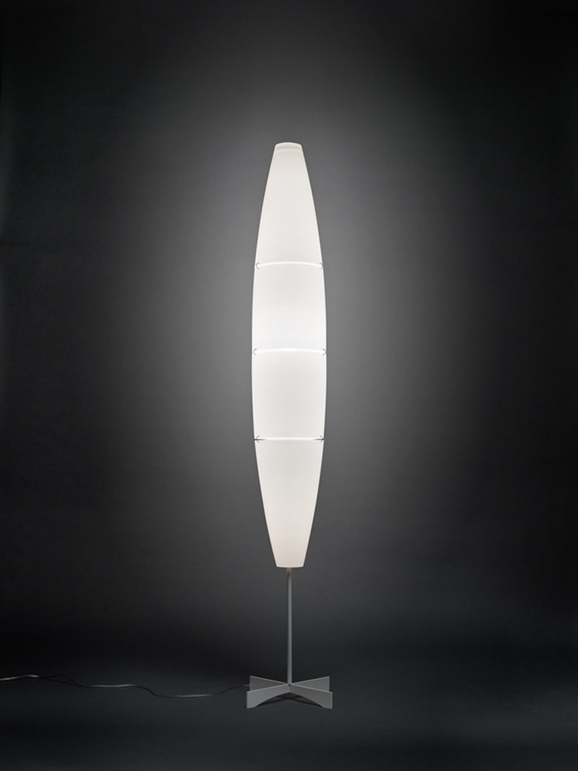 The floor lamp Havana has simple, essential and young lines but it stands out and is capable of characterizing any environment. The shade is formed by four elements in printed, satinized and polyethylene and is available in white; the stem and the base are in varnished or chrome-plated metal. Suspension and wall-mounted versions are also available. It is part of the design collection at the Museum of Modern Art (MOMA) in New York.
