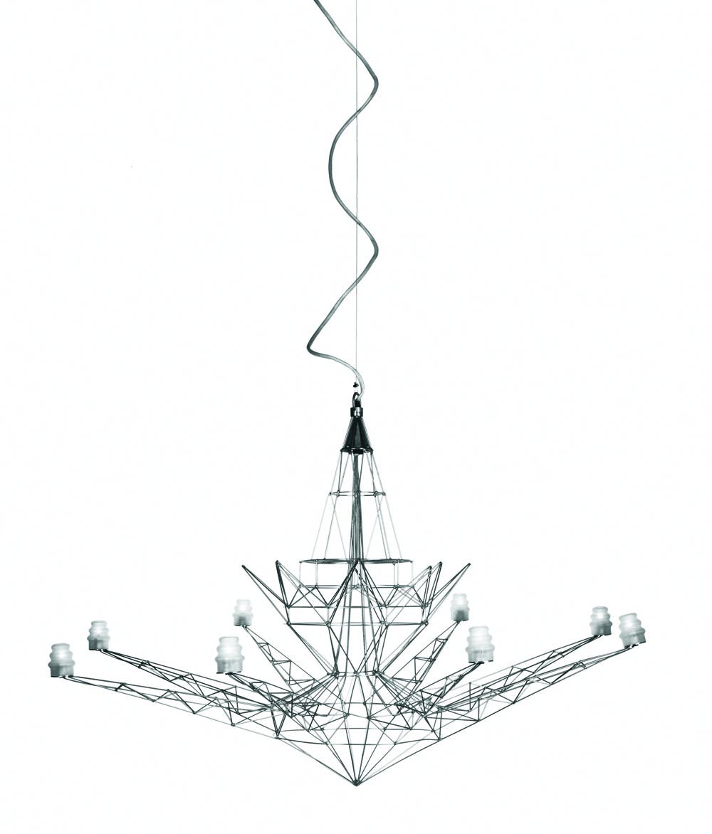 The classic ceiling lamp is rid of all its decorations: only the skeleton remains. The Lightweight suspension lamp combines a contemporary look with a semi craft-based production technique, a blend of innovation and tradition.