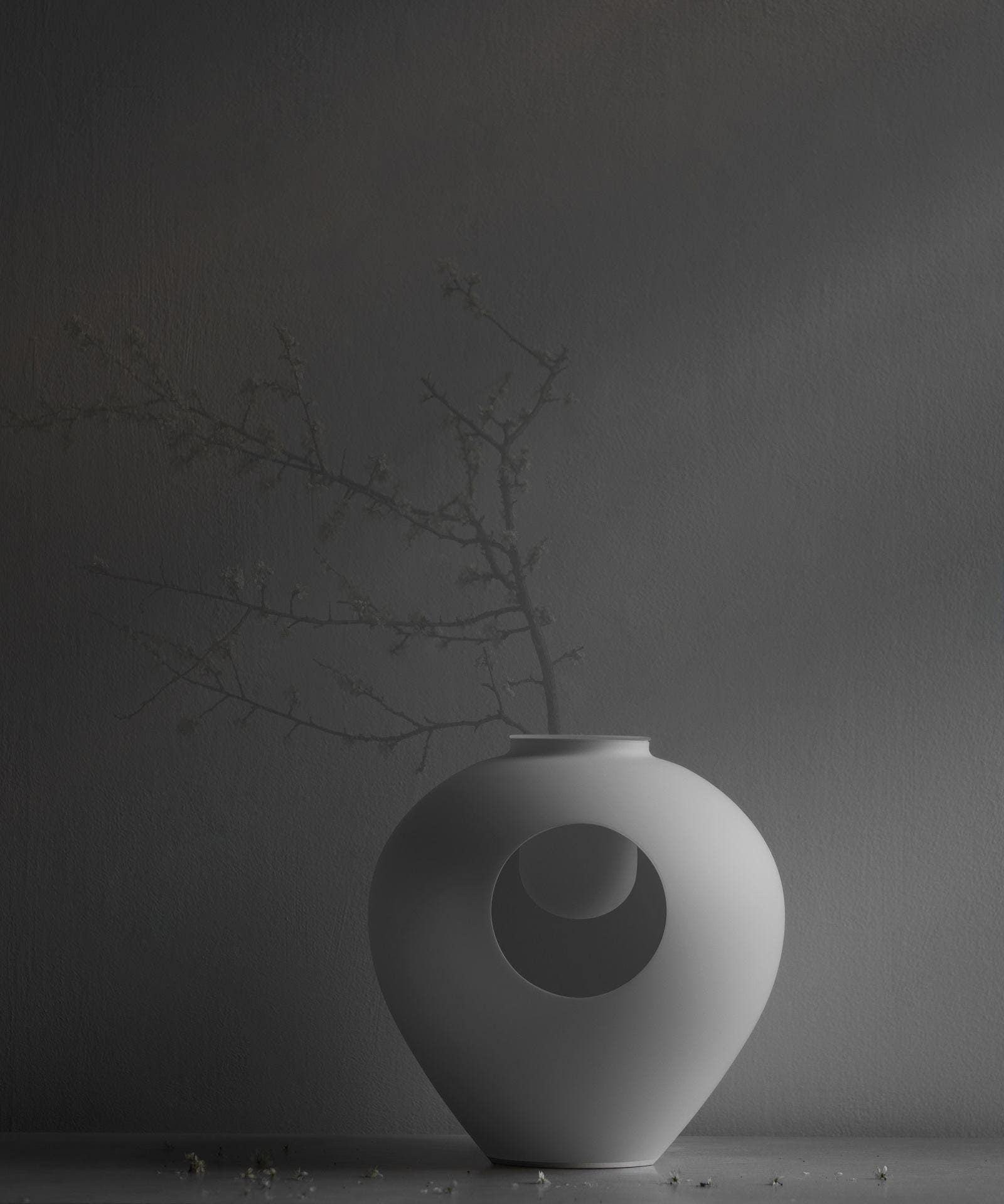Madre is a poetic and unexpected object filled with references. The opening, which interrupts the large luminous body, creates a magical vision, where internal and external light are exchanged and merge together, while the upper hollow conceals a vase, in which to place branches to create an elegant composition.