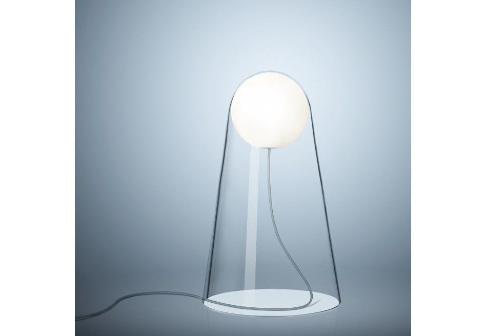 An illuminated sphere floats as if suspended in mid-air. A blown glass bell protects it and retains the globe of light that always looks as if it is about to take flight freely into space. Satellight is a simple lamp, capable of speaking straight from the heart in its poetic lightness.