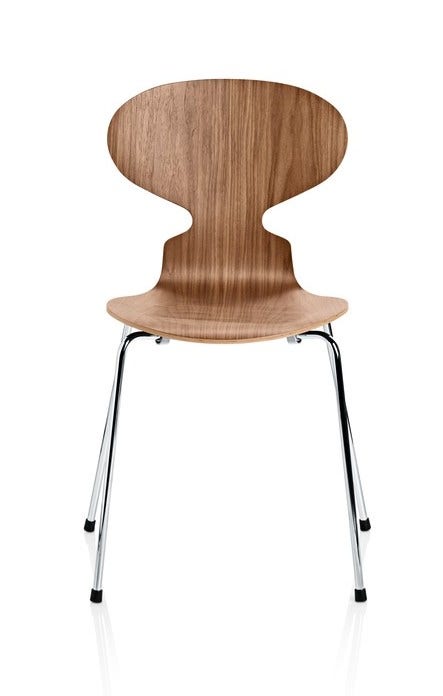 The Ant 4 Leg Chair Despite its minimalist form and svelte shape, the Ant by Arne Jacobsen is an extremely comfortable chair. The lamination process coupled with the qualities inherent in the wood make it flexible enough to adjust to the body's contours and movements. The Ant is a stackable wooden chair on a thin chrome or satin chrome base with a choice of three or four legs.