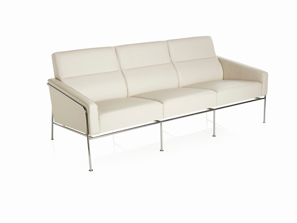 The 3300 series was created for the SAS Terminal at the Royal Hotel in Copenhagen, one of Arne Jacobsen’s architectural masterpieces. In harmony with Jacobsen’s architectural work at that time, the 3300 series is cool and formal. Furthermore, the 3300 series exudes Jacobsen’s unfailing sense of line and proportion and his ability to design everlasting classics. Arne Jacobsen got the inspiration for the 3300 series from a sofa, which he had designed especially for his own home in the 1940s. The 3300 series forms an elegant contrast to the organic shapes of the Egg and Swan chairs, also designed especially for the Royal Hotel. The 3300 series consists of a 1-seater easy chair as well as a 2-seater and 3-seater sofa and is sublime for waiting and lounge areas as well as for private homes. The series 3300 is available in various types of leather and fabric upholstery and always with a chromed base.