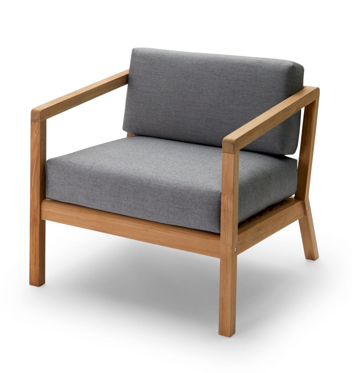 Virkelyst is a series of modern outdoor furniture with the seating comfort of indoor furniture. The simple wooden frame strikes a contrast with the thick, soft cushions. Able to withstand wind and weather, the upholstery fabrics are Oeko-Tex certified and extremely colour and lightfast as well as water and dirt-repellent and even mildew-resistant. The cushion dries quickly even after heavy downpour, as the foam has an open-cell structure that allows both water and air to pass through.