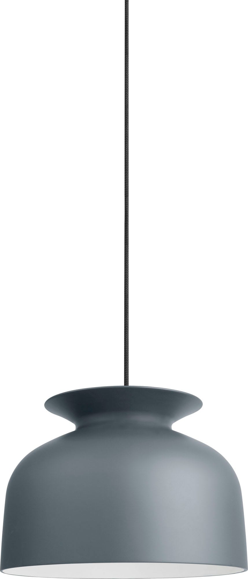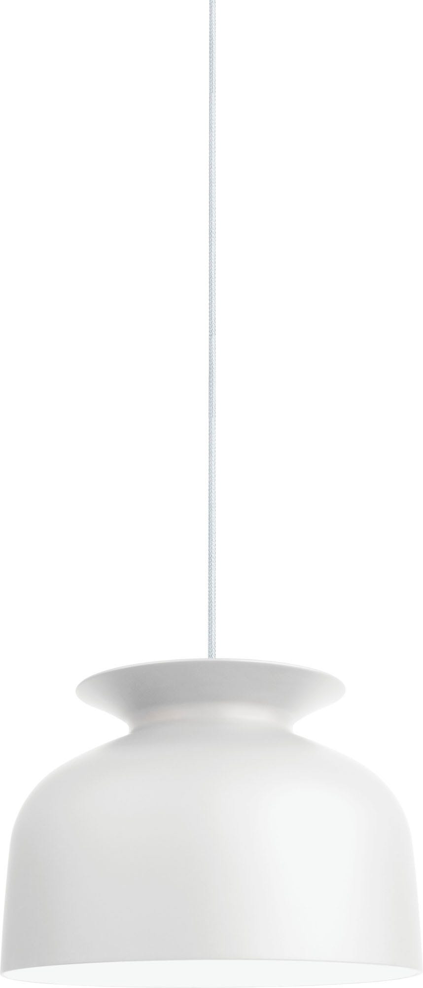 A unique detail of the Ronde Pendant is the opening on the top with an overhanging collar that reminds of a jar such as a vase or an amphora. The mainly downwards directed light from conventional pendants does in this design also spread out of the spout-like opening and casts a smooth light gradient at the wire and ceiling. The hand-turned aluminum lamp shade with an ultra-matt lacquer almost makes it look as if it was made of ceramics.