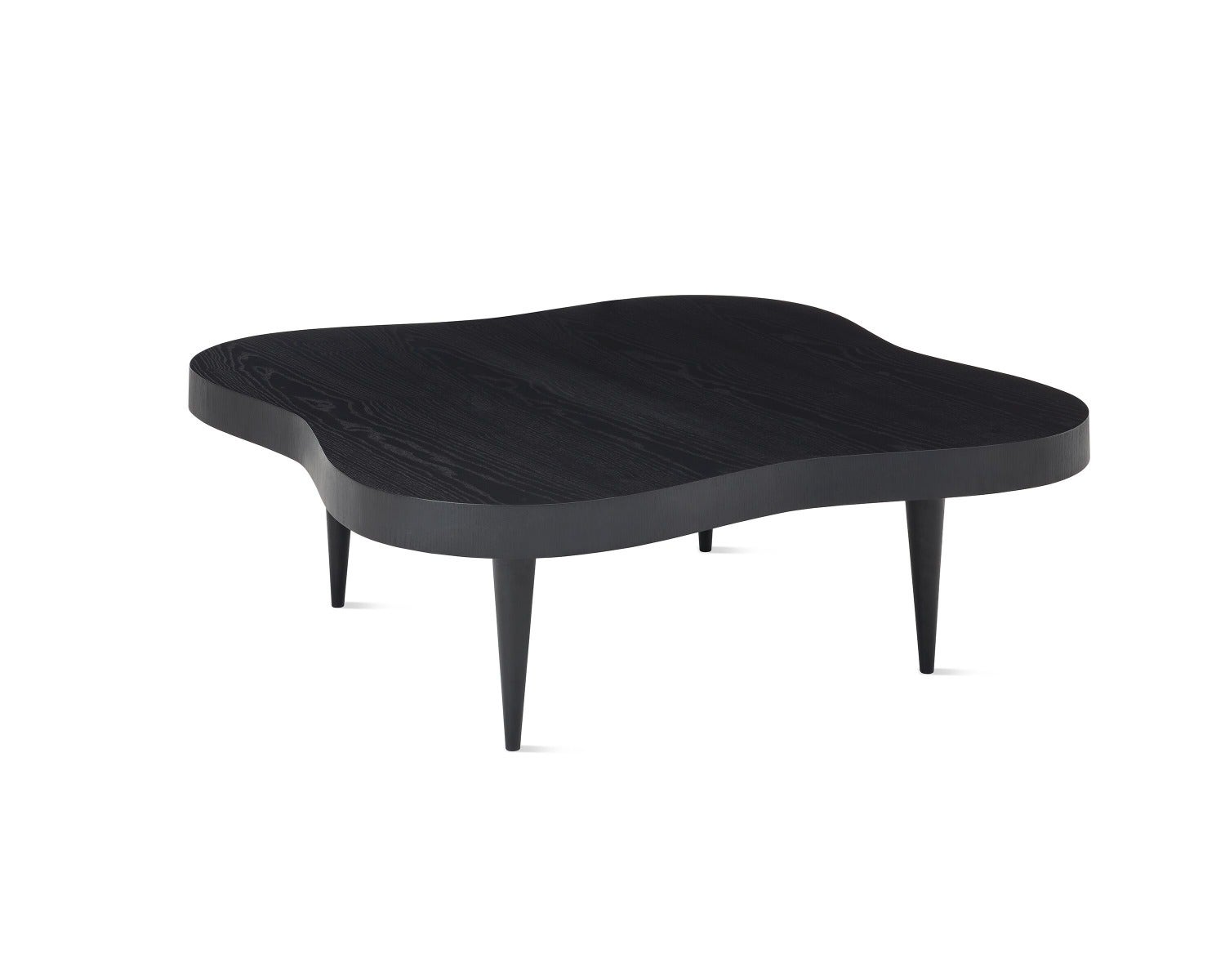 This 15" high coffee table features a curvilinear shape, designed by Gilbert Rohde and available with veneer top and solid wood legs in three finishes.