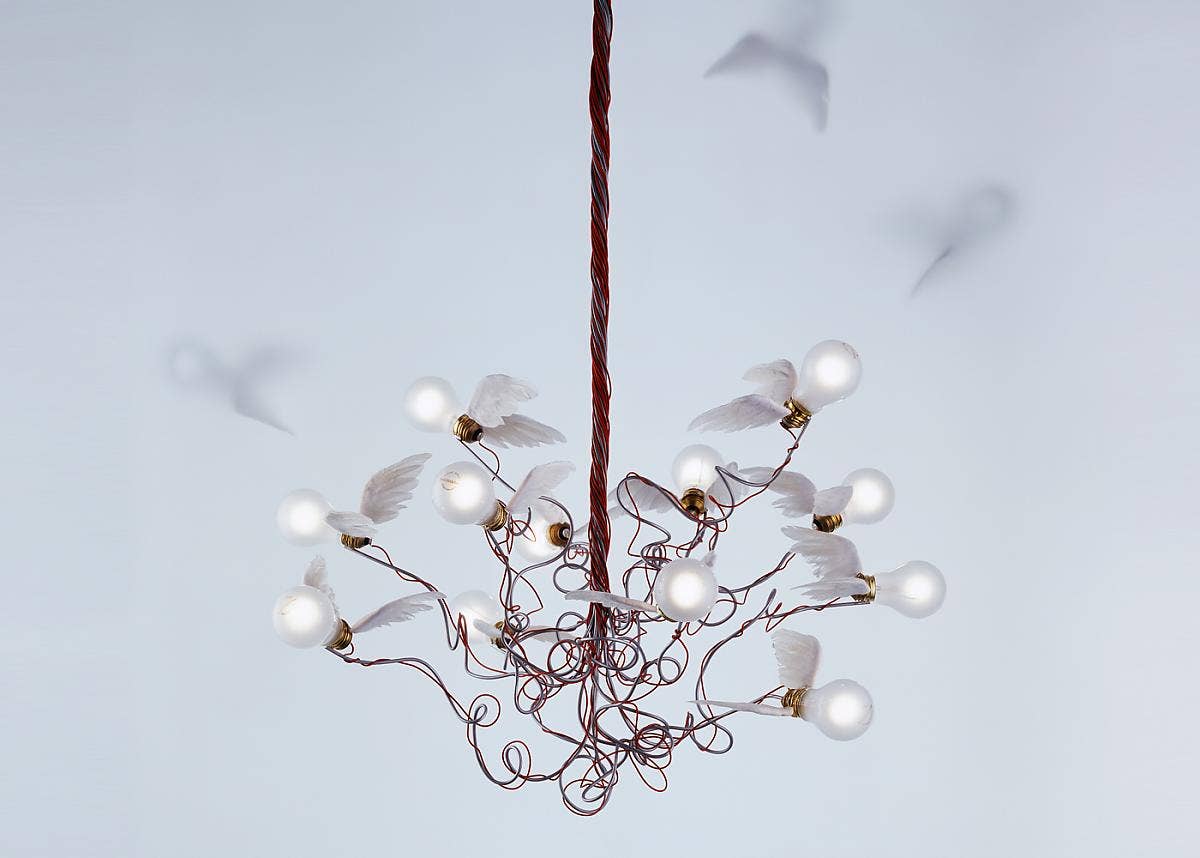 Twelve winged bulbs diverge from one another on tin-plated copper rods. The rods are shaped by hand and the user bends and stretches the rods into their final position.