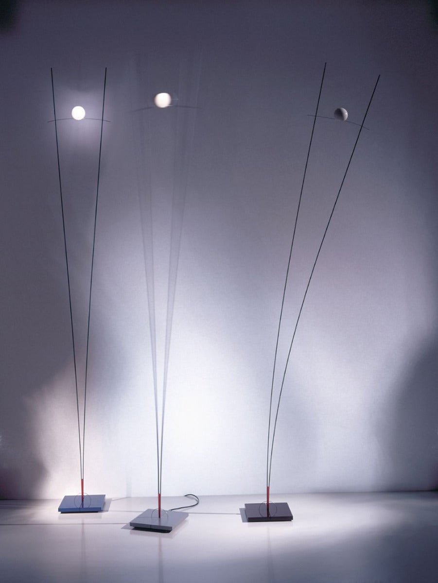 A round piece of opaline glass balances between two long metal rods. Ilios is an elegant standing lamp for accent lighting in situations in which calm, not overly bright light is required. A red, fluorescent isolation wedge at the lower end of the rods provides a minimal touch of color. Ilios is a design classic from the early 1980s, when low-voltage halogen bulbs first came into use. A secondary voltage of just 12 volts makes it possible to do without cables and to achieve a uniquely light appearance. The opaline glass provides soft, pleasant light. The halogen bulb casts unfiltered light backwards against the wall, so the room is also illuminated indirectly.