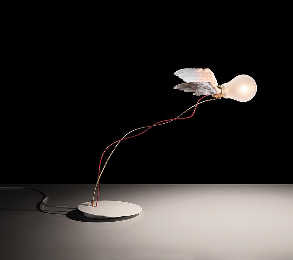 A popular Ingo Maurer classic: the Lucellino table lamp. The bulb with wings hovers movably above the table and is a real eye-catcher! Glass, brass, plastic, handmade wings made of goose feathers.