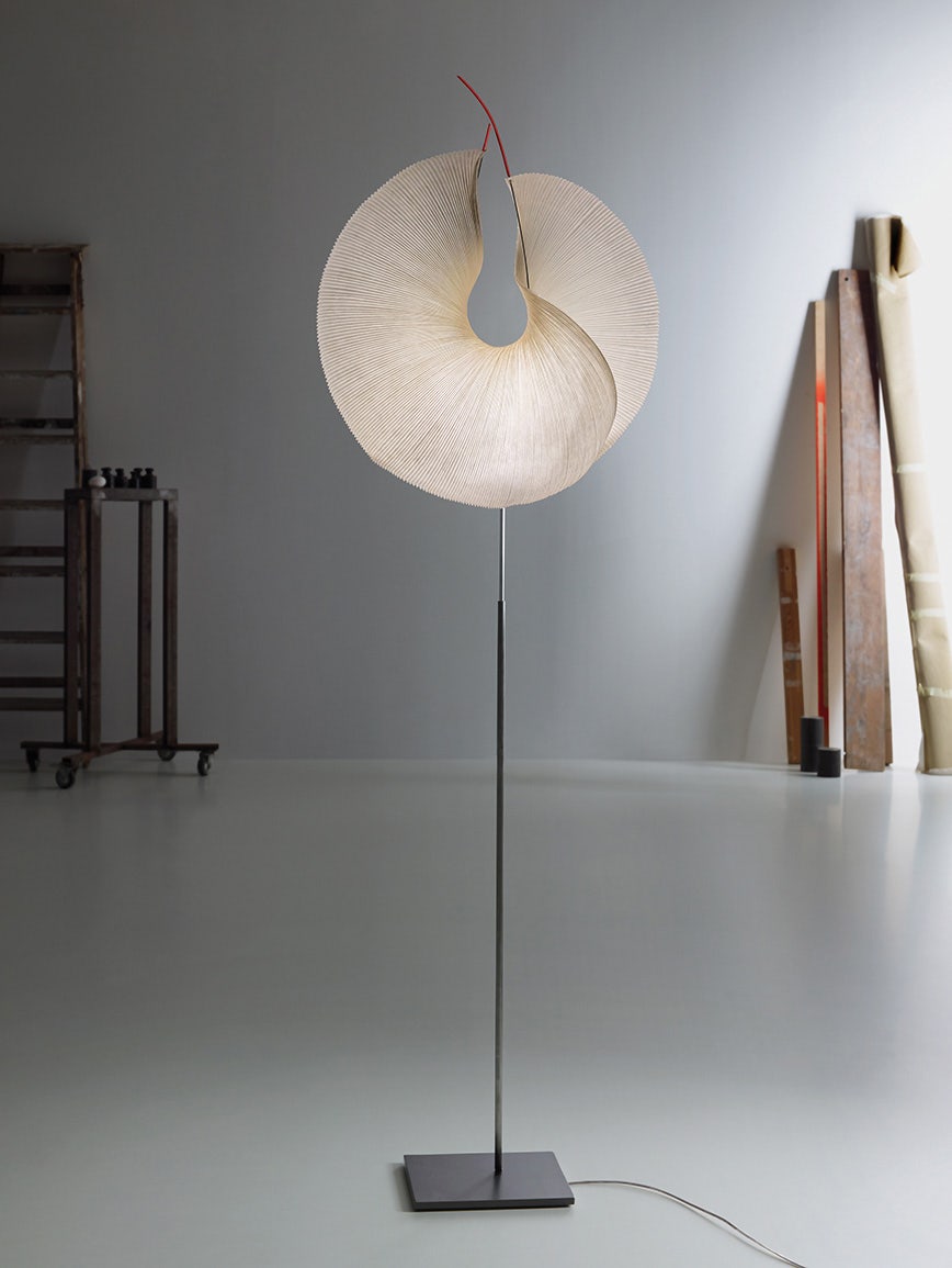 Yoruba Rose Floor is a new version of the floor lamp Yoruba Rose. Just as in all other MaMo Nouchies, the lampshade consists of Japanese paper, which has to undergo a special manufacturing process in Dagmar Mombach’s studio, until the desired shape is achieved. The light source is an LED module, provided with a cooling element, developed by Ingo Maurer especially for the MaMa Nouchies. Its light is so warm and soft, that any difference can hardly be noticed when compared to conventional halogen light sources.